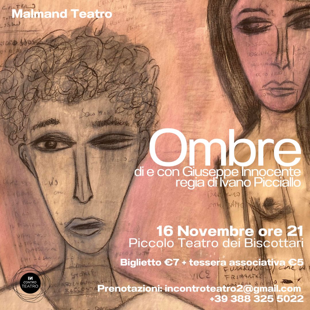 Questa l’atmosfera in cui ci si immergerà sabato 16 novembre quando, alle 21 al Piccolo Teatro dei Biscottari, al civico 27 di via dei Biscottari, spazio gestito dall’associazione “Incontroteatro”, andrà in scena “Ombre”, di e con Giuseppe Innocente per la regia di Ivano Picciallo, musiche di Angelo Sicurella, prodotto dalla compagnia MALMAND – IAC.