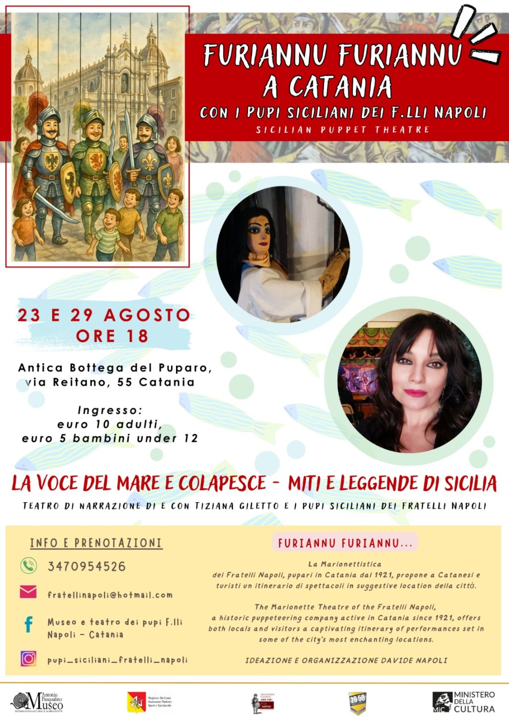 Catania- “C’è una voce antica che attraversa il tempo, parla al cuore dei naviganti e sussurra verità dimenticate: è la Voce del Mare, che narra e canta, incanta e avverte, con l’incedere solenne dei miti e la musicalità antica dei cunti siciliani”. Così Davide Napoli, direttore artistico dell’applaudita rassegna “Furriannu Furriannu a Catania con i Pupi siciliani dei Fratelli Napoli”, insieme all’attrice Tiziana Giletto, annuncia il nuovo atteso appuntamento che sabato 23 e venerdì 29 agosto, alle ore 18.00, negli storici spazi dell’Antica Bottega del Puparo, in via Reitano 55 a Catania, vedrà la messa in scena di “La Voce del mare e Colapesce- miti e leggende di Sicilia”.