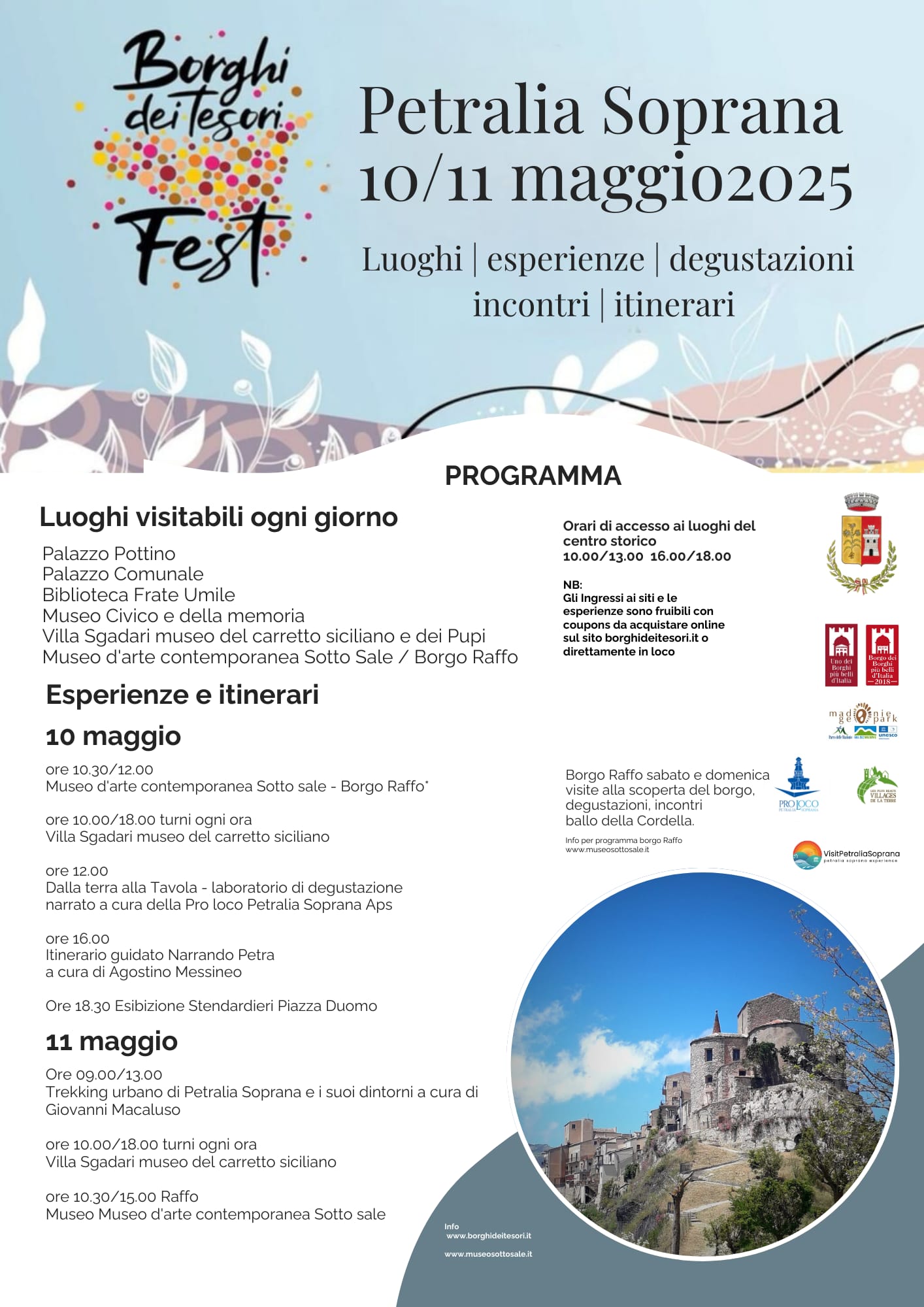 Sabato 10 e domenica 11 maggio 2025 torna il Borghi dei Tesori Fest a Petralia Soprana. Il paese madonita è tra i protagonisti dell’edizione primaverile del festival promosso dalla Fondazione Le Vie dei Tesori. Un’occasione unica per immergersi nel fascino autentico di questo borgo arroccato a 1.147 metri d’altitudine, tra i più alti e suggestivi della Sicilia, riconosciuto come “Borgo più bello d’Italia” nel 2018.
