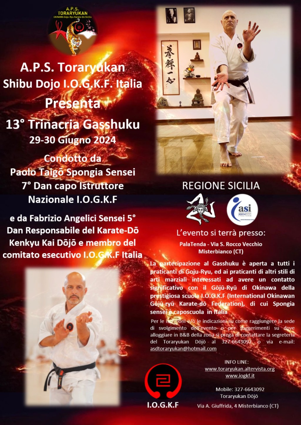Appuntamento imperdibile lo scorso fine settimana all’insegna delle arti marziali: A.P.S. Toraryukan Shibu Dojo I.O.G.K.F. Italia, società affiliata ASI, hanno presentato il 13º Trinacria Gasshuku che si è tenuto al Palatenda di via S. Rocco Vecchio a Misterbianco. L’evento è stato condotto da Paolo Taigō Spongia Sensei, 7º Dan capo Istruttore Nazionale I.O.G.K.F. e da Fabrizio Angelici Sensei 5º Dan Responsabile del Karate-Dō Kenkyu Kai Dōjō e membro del comitato esecutivo I.O.G.K.F. Italia. La partecipazione al Gasshuku è stata aperta a tutti i praticanti di Goju-Ryu e ai praticanti di altri stili di arti marziali interessati ad avere un contatto significativo con il Goju-Ryu di Okinawa della prestigiosa scuola I.O.G.K.F. (International Okinawan Goju-Ryu Karate-Dō Federation) di cui Spongia Sensei è caposcuola in Italia.
