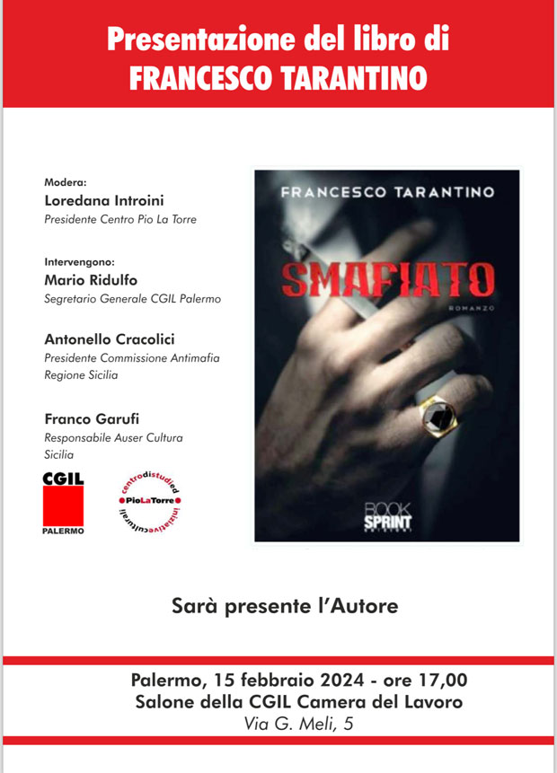 Il 15 febbraio, ore 17, presentazione del libro “Smafiato” di Francesco Tarantino alla Camera del Lavoro, in via Meli, 5. Intervengono Mario Ridulfo, Antonello Cracolici, Franco Garufi. Modera Loredana Introini