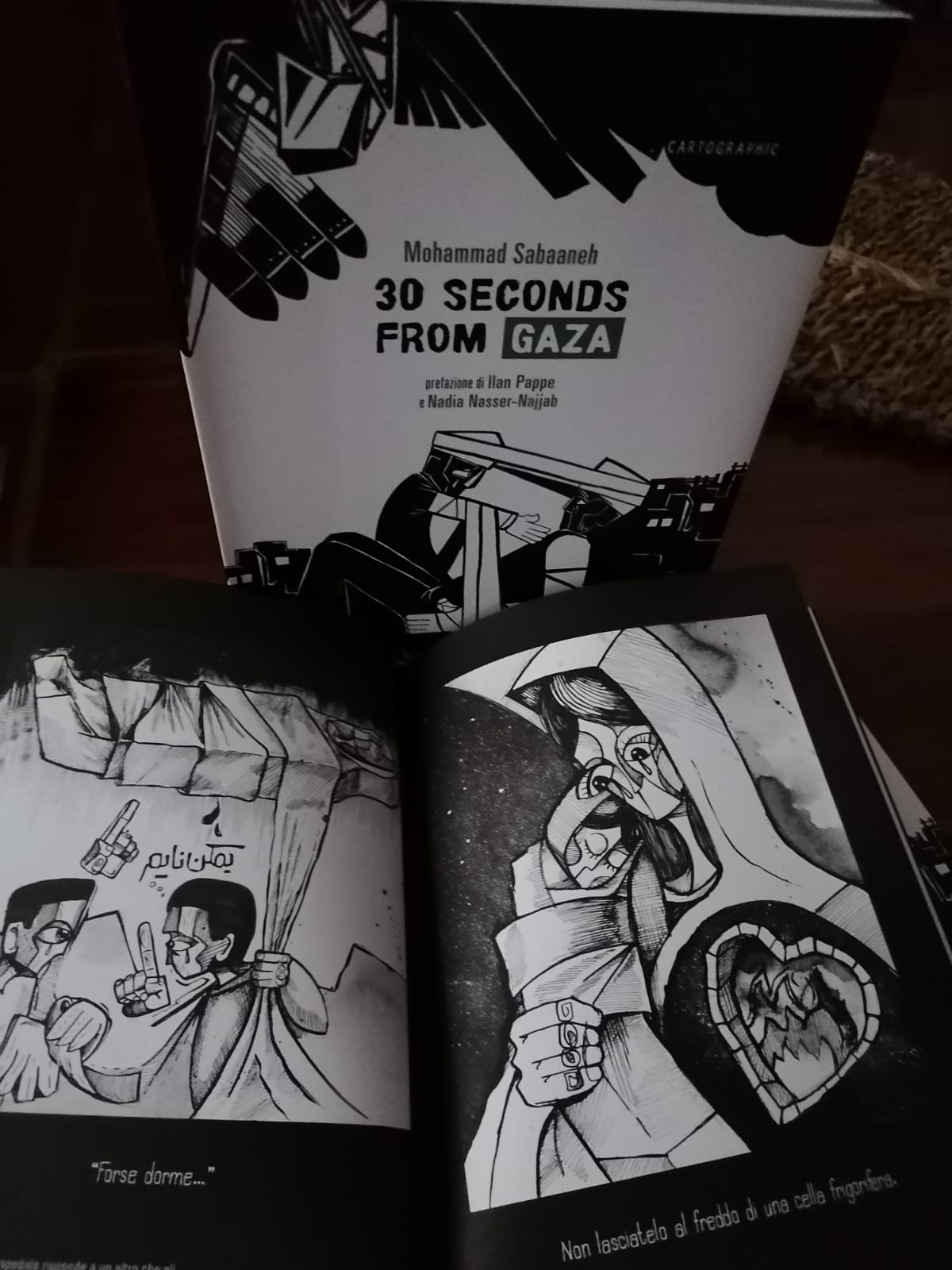 “30 Seconds from Gaza” è un libro che racconta la complessità della vita nella Striscia di Gaza attraverso il linguaggio potente e universale dell’arte. Sabaaneh, famoso vignettista pluripremiato, utilizza il disegno per descrivere la realtà quotidiana di una terra segnata da conflitti, privazioni e resistenza. “30 seconds from Gaza” documenta il genocidio in corso a Gaza dal 7 ottobre 2023, ricordandoci che in realtà si tratta di un massacro in corso da oltre 75 anni. Vi sono raccolte 99 tavole realizzate in digitale e disegni a china, su carta di risulta e con colori di fortuna (caffè, inchiostro diluito, ecc.), ispirate a immagini e video postati sui social dalle stesse vittime delle innumerevoli stragi in atto ancora oggi. Con un approccio visivo e toccante, il suo libro riesce a trasmettere la resilienza e la sofferenza del popolo palestinese.
