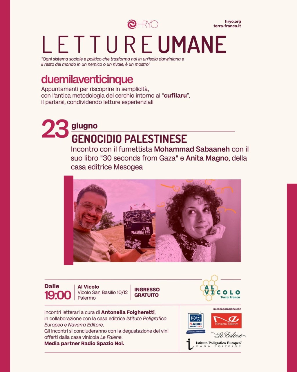 Palermo, una città storica che ha sempre accolto la cultura e il dialogo internazionale, sarà il palcoscenico per la presentazione del libro “30 Seconds from Gaza” dello scrittore e fumettista palestinese Mohammad Sabaaneh. L’evento si inserisce nell’ambito della rassegna Letture Umane, organizzata da HRYO (Human Rights Youth Organization), un progetto che mira a promuovere libri e idee capaci di ispirare riflessioni profonde e cambiamenti sociali.