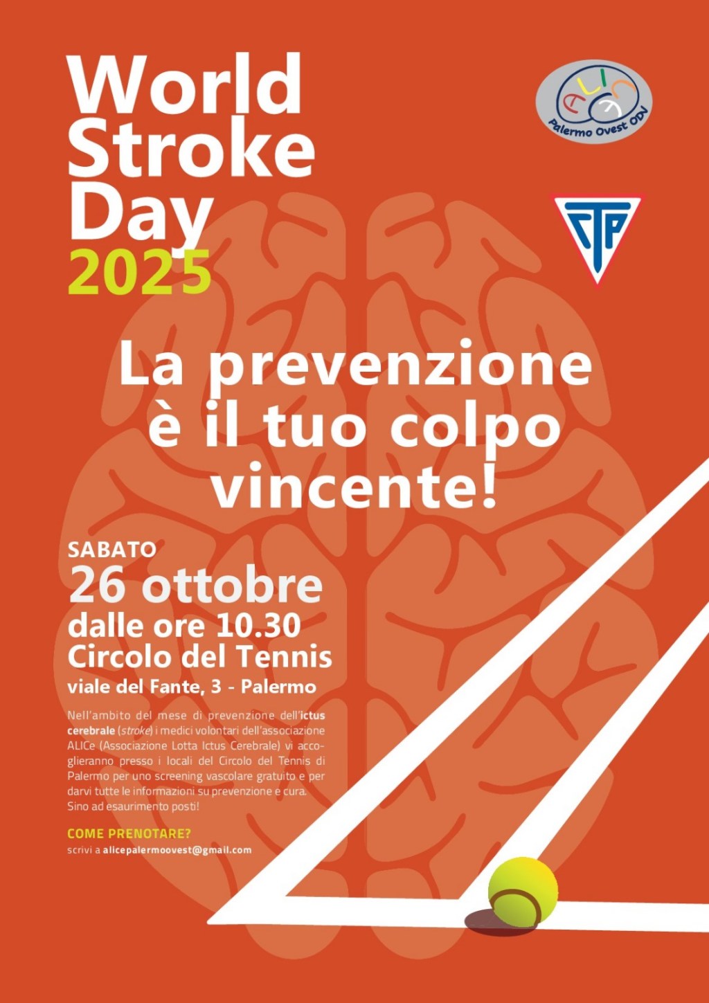 Il 26 di ottobre (mese dedicato dalla World Stroke Organization alla prevenzione dell’ictus), A.L.I.Ce. Palermo Ovest, associazione NO PROFIT costituita da operatori sanitari e pazienti impegnati nella lotta all’ictus cerebrale, svolgerà una iniziativa di screening per il rischio cerebrovascolare presso il Circolo del Tennis di Palermo. Coloro che aderiranno saranno accolti da medici specializzati nella cura dell’ictus e dai volontari di A.L.I.Ce..