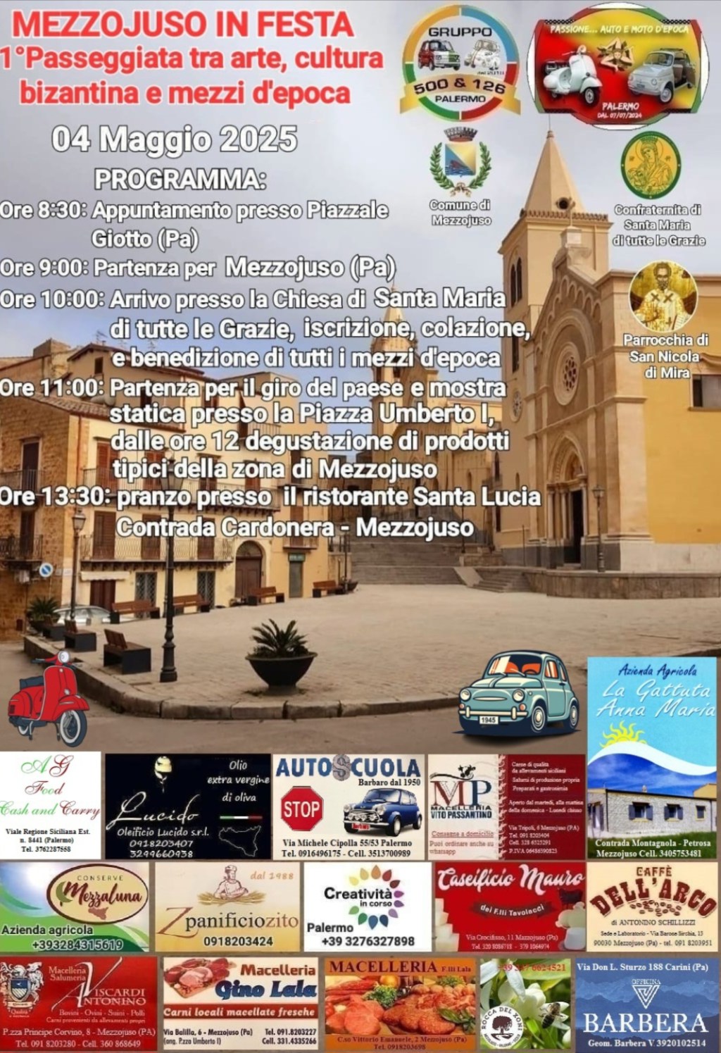 In data 04 maggio 2025 nel borgo antico di Mezzojuso in provincia di Palermo verrà organizzata dal gruppo “Passione… auto e moto d’epoca Palermo” di Padalino V. Mirto G. Filizzolo G. e Amatuzzo V. una sfilata di mezzi d’epoca.