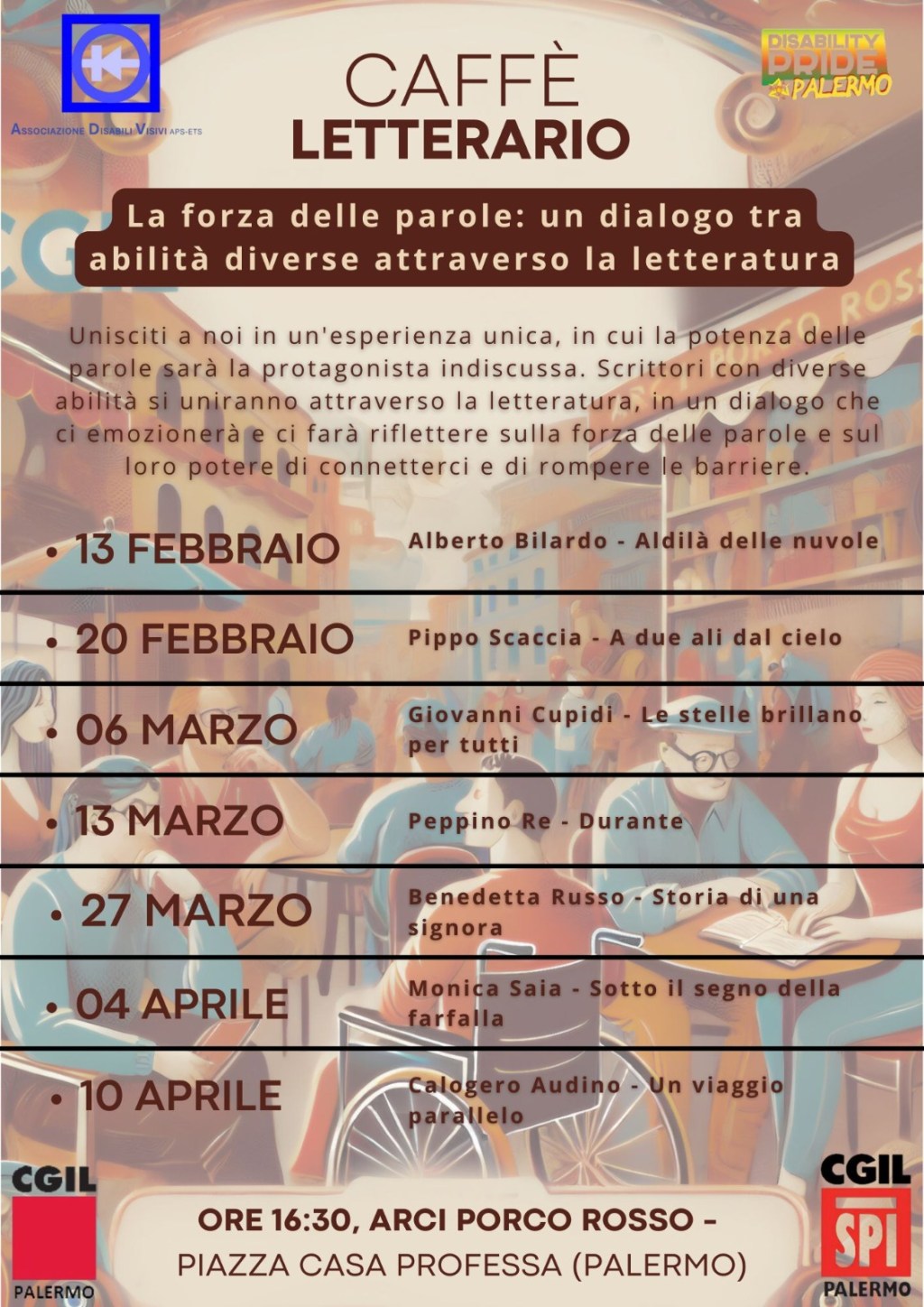Scrittori e scrittrici con diverse abilità si uniranno attraverso la letteratura in un dialogo che farà riflettere sul potere della parola di connetterci e di rompere le barriere. Il caffé letterario si terrà presso la sede di Arci Porco Rosso di piazza Casa Professa.