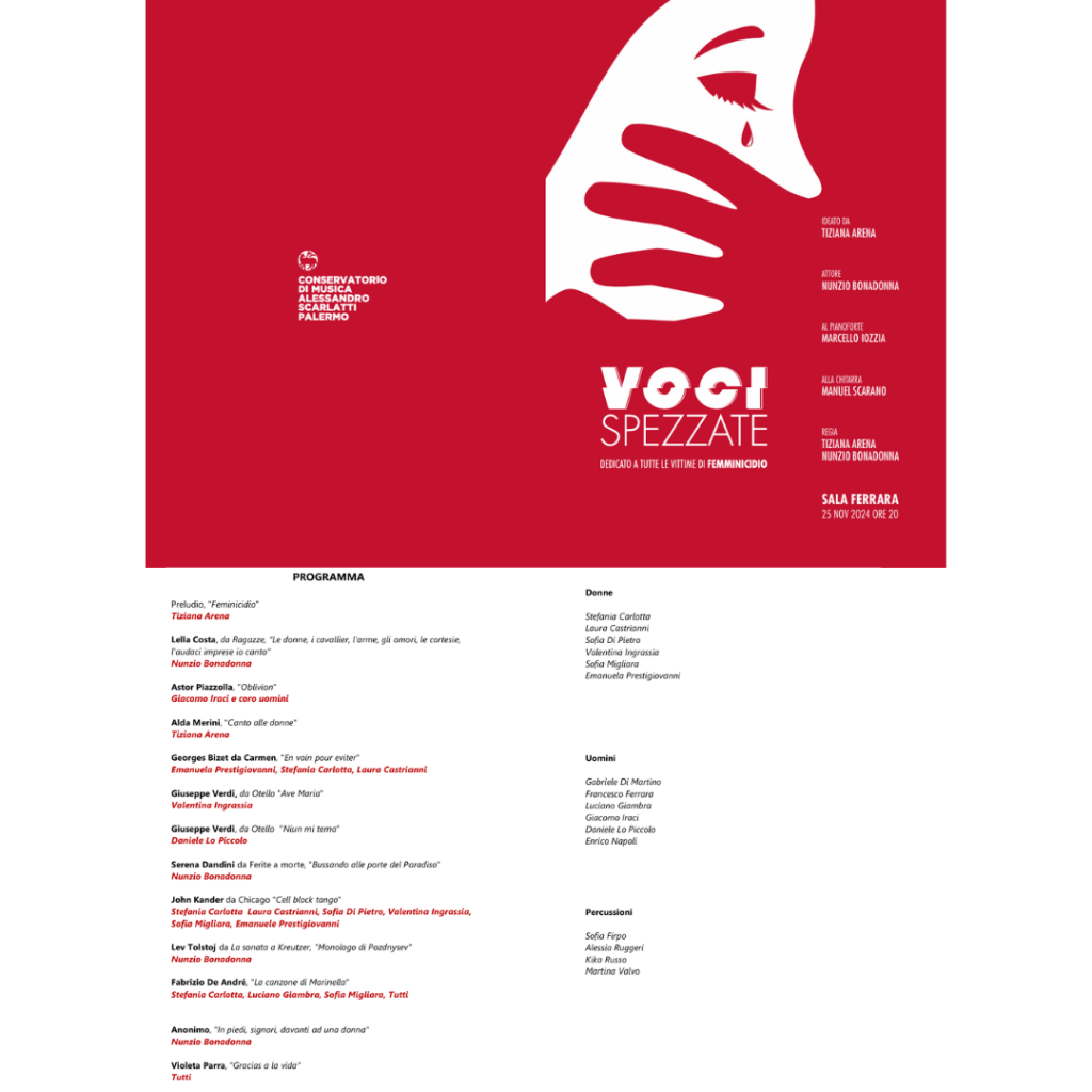 Il concerto “Voci spezzate” dedicato a tutte le vittime di femminicidio è ideato dalla Professoressa Tiziana Arena che ne cura anche la regia assieme a Nunzio Bonadonna che riveste anche il ruolo attore, al pianoforte il M° Marcello Iozzia e alla chitarra il M° Manuel Scarano.