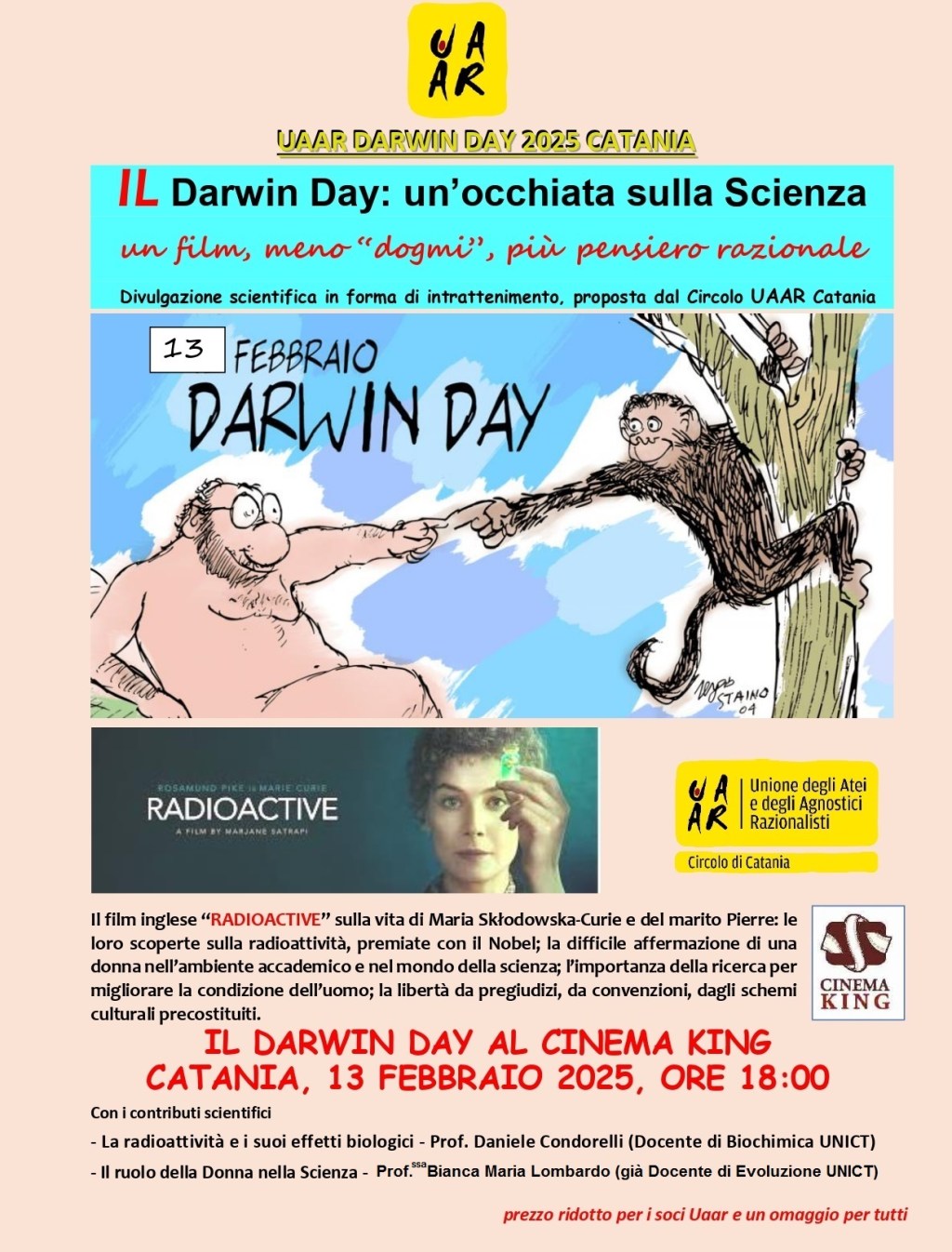 Il 13 febbraio 2025, in collaborazione con il cinema King, il Circolo Uaar di Catania propone il film inglese “Radioactive” sulla vita di Maria Skłodowska-Curie e del marito Pierre: le loro scoperte sulla radioattività, premiate con il Nobel; la difficile affermazione di una donna nell’ambiente accademico e nel mondo della scienza; l’importanza della ricerca per migliorare la condizione dell’uomo; la libertà da pregiudizi, da convenzioni, dagli schemi culturali precostituiti.