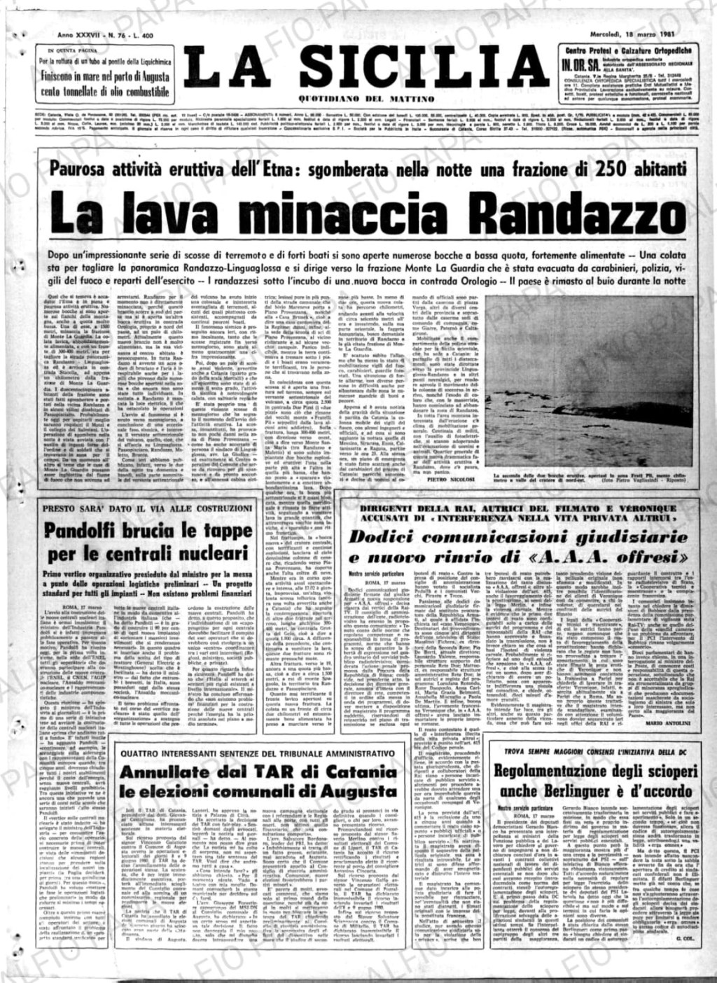 C’è una memoria che non sbiadisce. Non è scritta soltanto nei libri o negli archivi, ma negli occhi di chi c’era, nelle parole sussurrate nelle piazze, nel silenzio che ancora oggi avvolge certe contrade. È la memoria del 17 marzo 1981, il giorno in cui il respiro della terra si fece fuoco e scese a valle, puntando dritto verso Randazzo. La mattina successiva, il quotidiano La Sicilia apriva con un titolo che ancora oggi vibra come un eco lontano: “Paurosa attività eruttiva dell’Etna: sgomberata nella notte una frazione di 250 abitanti – La lava minaccia Randazzo”. Non era un’esagerazione giornalistica. Era la fotografia di una paura reale.