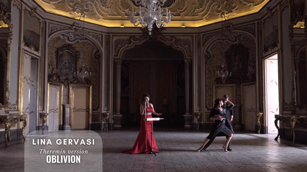 Esce Oblivion, l’intensa e raffinata rilettura di Lina Gervasi dall’omonima colonna sonora di Astor Piazzolla per l’Enrico IV di Marco Bellocchio disegnata con i magici suoni del suo theremin. Seconda tappa di un viaggio attraverso le grandi colonne sonore che la Gervasi ha pensato proprio per questo strumento tanto futurista quanto capace di antiche suggestioni. Al suo fianco nel videoclip che supporta questa uscita due raffinati ballerini di tango argentino: Barbara Carpino e Claudio Forte, siracusani come Lina Gervasi. Tutti e tre avvolti in una magica simmetria visiva fra l’abbraccio dei due ballerini, da una parte, e il gesto e la postura fra Lina e il suo strumento. Magia che trova la sua eco e risonanza fra le splendide mura di Palazzo Biscari, uno degli edifici storici più belli di Catania.