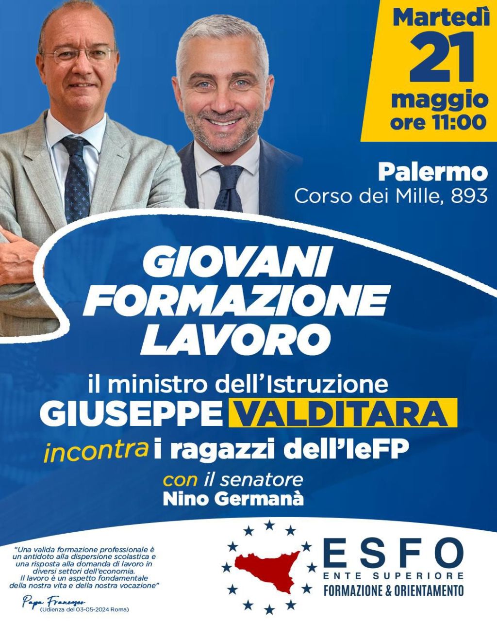 Il ministro dell’Istruzione e del Merito del Governo Meloni Giuseppe Valditara e il senatore Nino Germanà faranno visita, martedì 21 maggio alle 11:00, alla sede dell’Ente Superiore Formazione e Orientamento, in corso dei Mille 893 a Palermo.