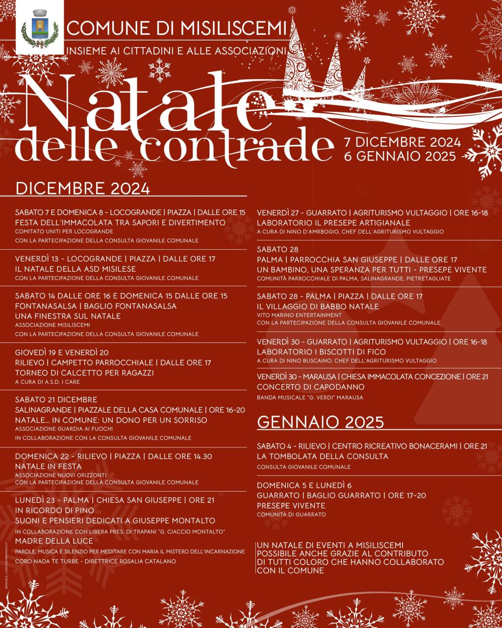L’Amministrazione Comunale di Misiliscemi, assieme alle Associazioni del territorio, e ai cittadini, ha definito un ricco cartellone di eventi per le festività natalizie e di fine anno, per condividere con chi lo vorrà, dei momenti di festa legati alle tradizioni in un clima di collaborazione e armonia, che caratterizza la comunità misilese. Il “Natale delle contrade” prevede tanti appuntamenti, dal 7 dicembre al 6 gennaio, che offriranno ai cittadini del territorio un’occasione in più per conoscere e apprezzare le peculiarità che caratterizzano Misiliscemi, in un’ottica di fraternità e relax.