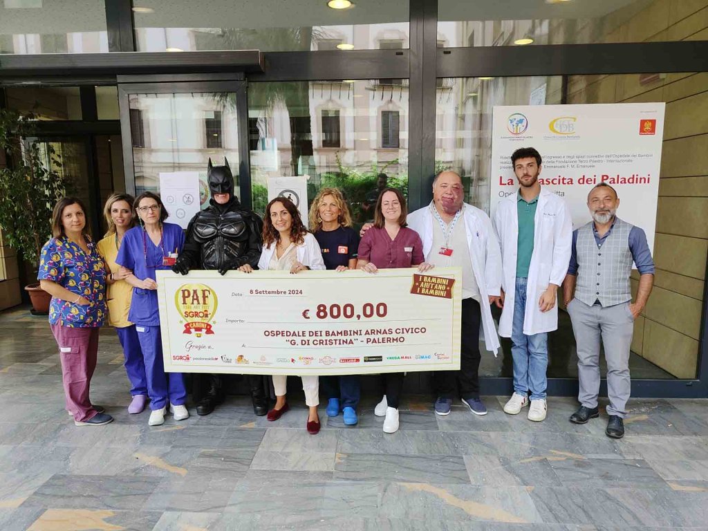 Alla consegna erano presenti Nino Messina, ideatore del PAF, il dottor Santo Fruscione, dirigente medico dell’Ospedale dei Bambini, e i medici del “Di Cristina”. Ieri mattina era presente anche Batman, alias Salvatore Monni, uno dei più famosi cosplayers italiani del supereroe della DC, arrivato da Cagliari appositamente per consegnare l’assegno e portare un po’ di gioia ai piccoli pazienti dell’ospedale.