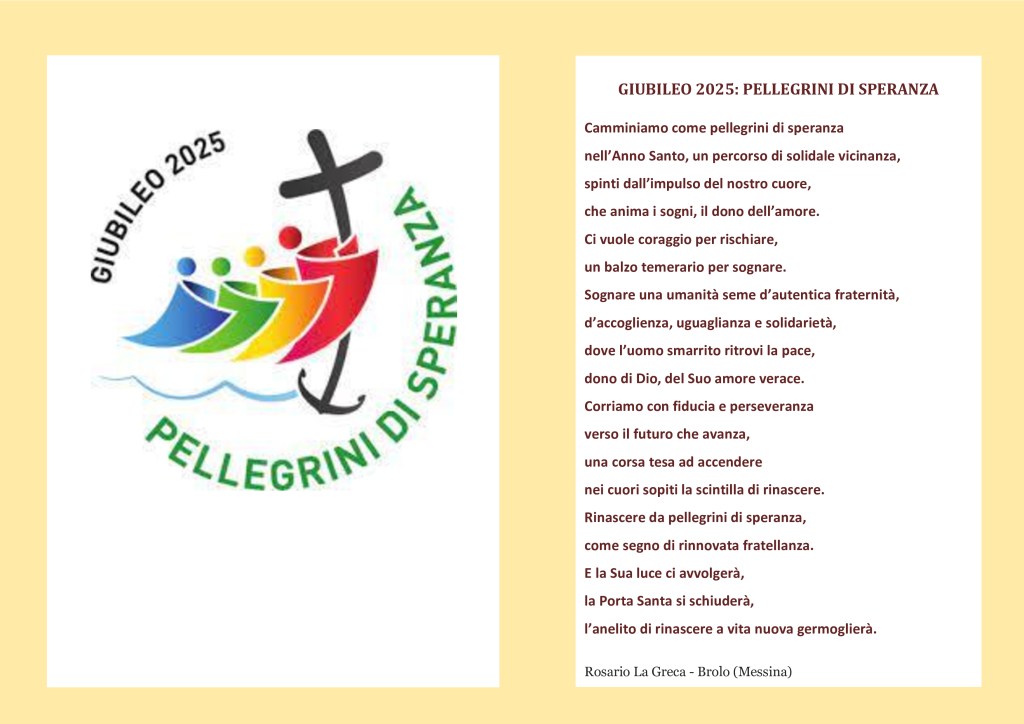 La prima Porta ad essere stata aperta è quella della Basilica di San Pietro, aperta da Papa Francesco il 24 Dicembre 2024, inizio del Giubileo, seguita dall’apertura di altre 4 Porte Sante nelle Basiliche papali di Roma. Il poeta Rosario La Greca di Brolo (Messina) ha composto la poesia: ”Giubileo 2025: Pellegrini di speranza”, come segno di omaggio al Giubileo, ha il piacere di condividere l’opera.