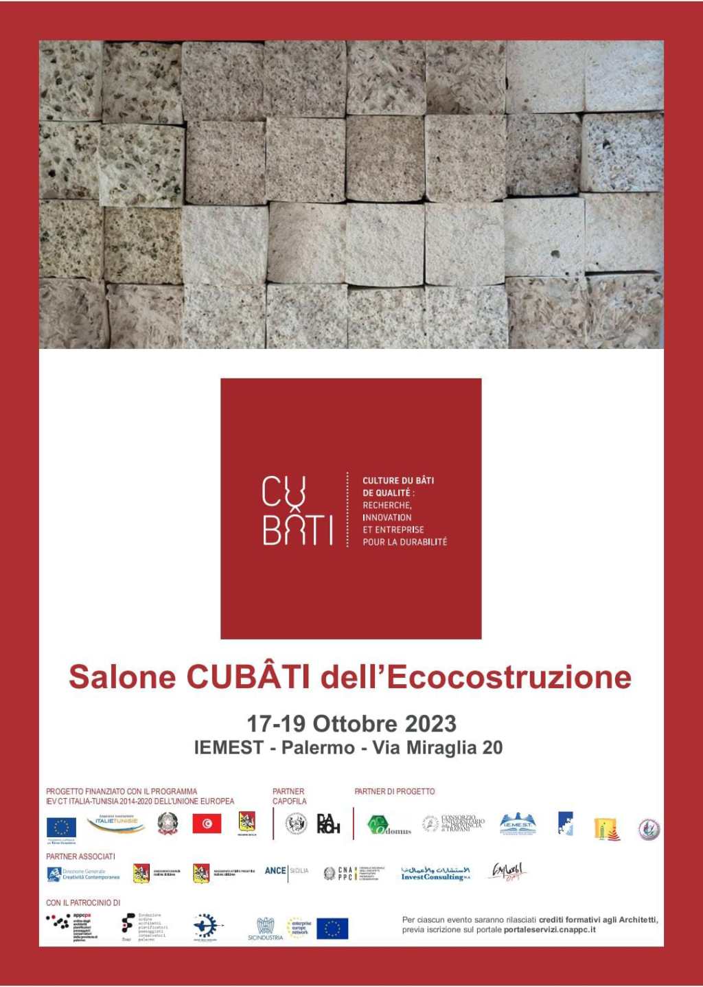 Una tre giorni per confrontarsi sul tema dell’ecocostruzione con gli esperti del settore. Dal 17 al 19 ottobre presso la sede dell’Istituto Euro-Mediterraneo di Scienza e Tecnologia (Iemest), in via Michele Miraglia 20 a Palermo, si terrà il Salone Cubâti dell’Ecocostruzione organizzato nell’ambito del progetto Cubâti – Culture du bâti de qualité: Recherche, Innovation et Entreprise pour la Durabilité finanziato dal Programma di Cooperazione transfrontaliera Italia-Tunisia 2014-2020. Obiettivo del Salone è offrire ad aziende siciliane e tunisine, attive nel settore dell’edilizia, l’opportunità di presentare le soluzioni tecnologiche ecosostenibili da loro sviluppate e costituire un’occasione di incontro a livello transfrontaliero con il mondo della professione e della ricerca. Saranno presenti PalermoArchitettura (UNIPA-DARCH) in qualità di capofila del progetto, il Consorzio Ecodomus per l’edilizia sostenibile, il risparmio energetico e le tecnologie alimentate da fonti rinnovabili (ECD), il Consorzio Universitario della Provincia di Trapani (CUTP), l’Istituto Euro-Mediterraneo di Scienze e Tecnologia (IEMEST), l’École Nationale d’Architecture et d’Urbanisme (ENAU), Agence de Mise en Valeur du Patrimoine et de Promotion Culturelle (AMVCPP) e il Centre International des Technologies de l’Environnement de Tunis (CITET).