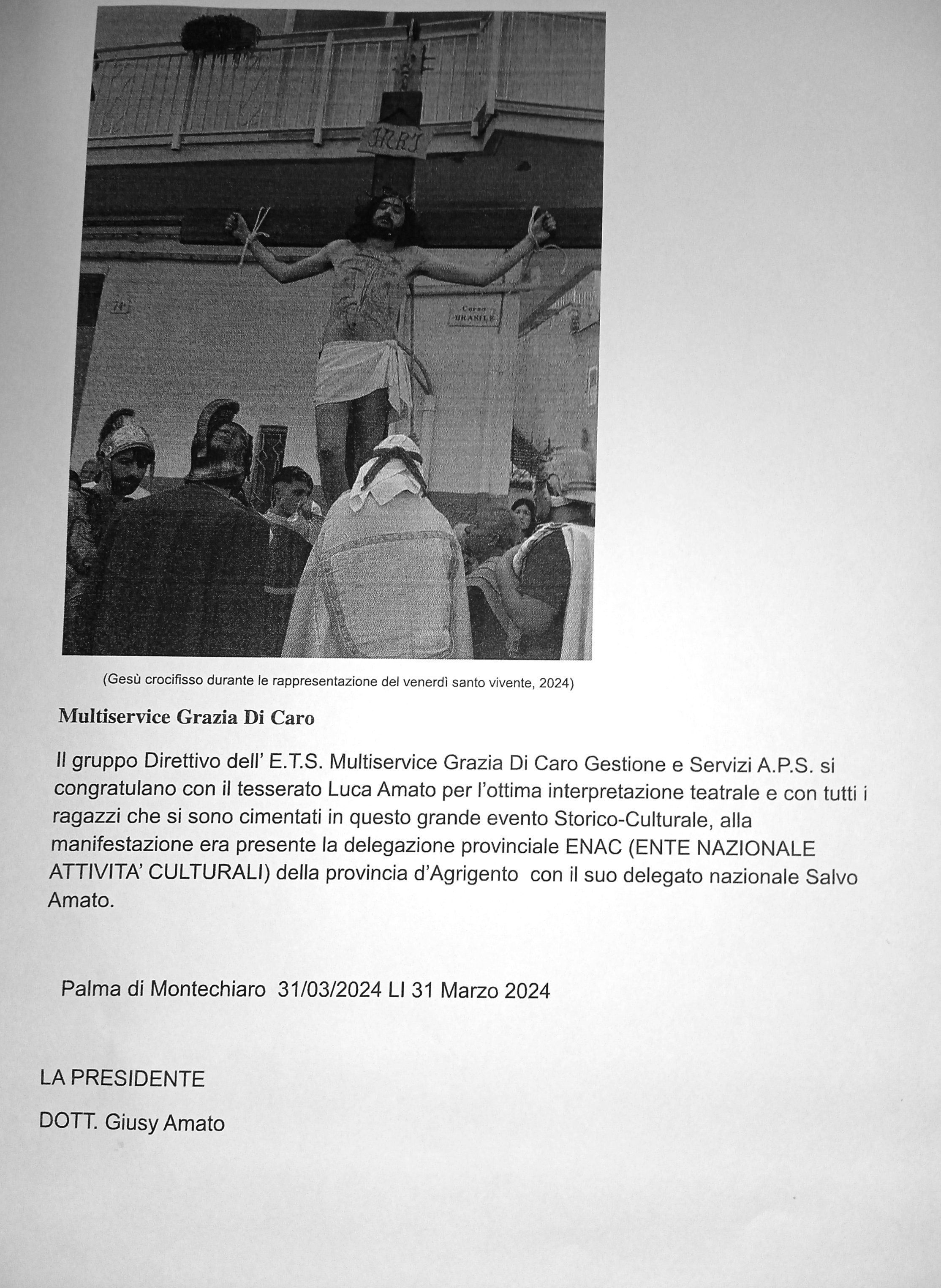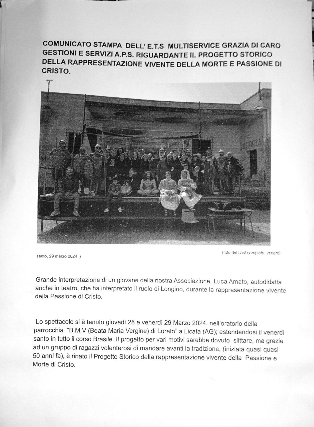 Ets Multiservice Grazia di Caro gestioni e servizi a.p.s. riguardante il progetto storico della rappresentazione vivente della morte e passione di Cristo