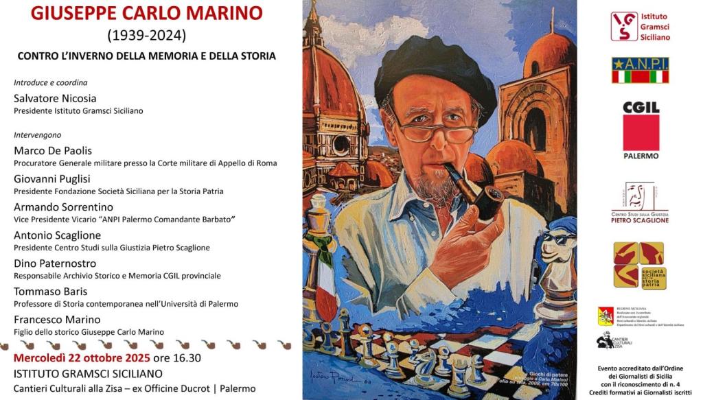 Palermo 20 ottobre 2025 – Sarà ricordato mercoledì 22 ottobre, alle 16,30, presso l’Istituto Gramsci Siciliano, ai Cantieri Culturali alla Zisa, il professor Giuseppe Carlo Marino, con un convegno dal titolo “Contro l’inverno della memoria e della storia”.