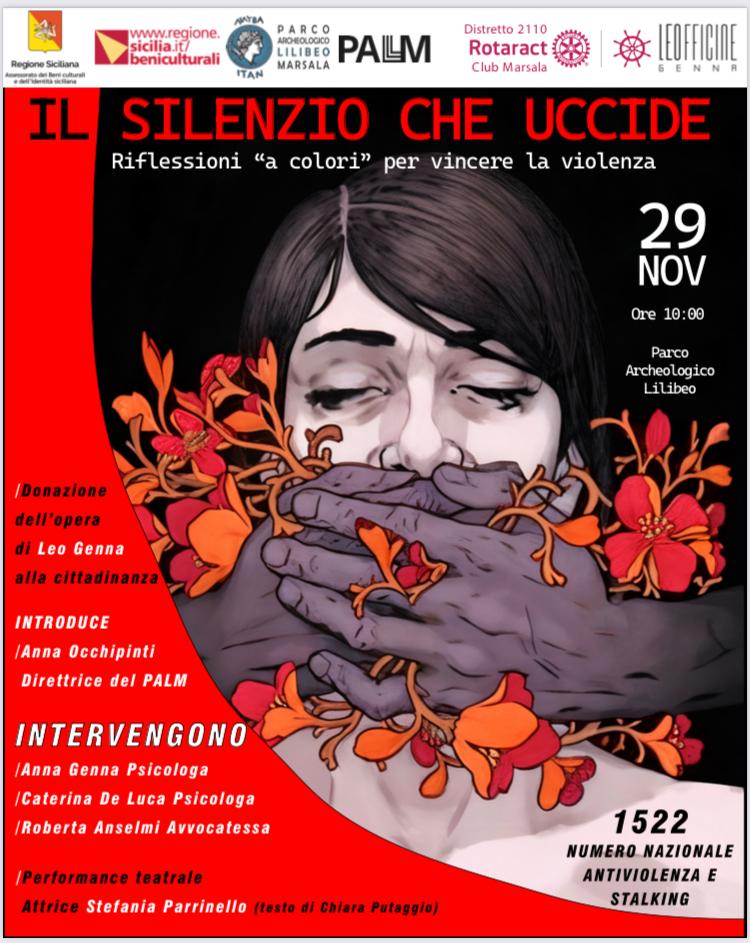 In un’ottica di apertura alle tematiche sociali oltre che culturali, il Parco Archeologico di Lilibeo Marsala aderisce all’iniziativa lanciata dal Rotaract Club di Marsala e dalle Leofficine Genna per la Giornata dedicata al contrasto della violenza sulle donne, con un evento organizzato insieme presso la Sala conferenze “M. L. Famà” che si svolgerà il 29 novembre, alle ore 10:00, dal tema Il silenzio che uccide. Riflessioni “a colori” per vincere la violenza sulle donne.