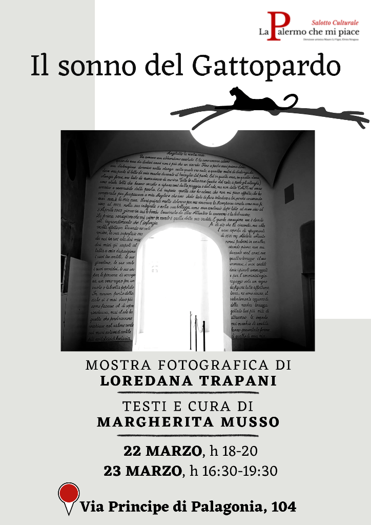 Nei pomeriggi di venerdì 22 e sabato 23 marzo 2024, il salotto culturale “La Palermo che mi piace” di via Principe di Palagonia 104, a Palermo, ospita “Il sonno del Gattopardo”, mostra fotografica di Loredana Trapani e testi e cura di Margherita Musso.