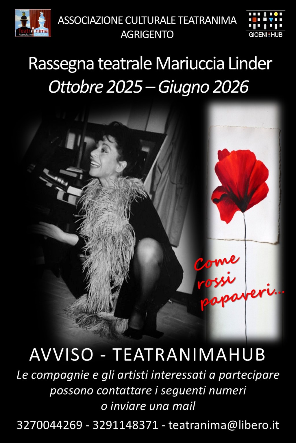Al via i preparativi per la rassegna teatrale “Mariuccia Linder” – 2025/2026, ideata e coordinata dalla Associazione Culturale TeatrAnima di Agrigento, proprio con l’intento di continuare a tenere vivo il ricordo umano ed artistico di Mariuccia Linder, insegnante di Educazione artistica e di Storia dell’Arte ad Agrigento, nonché pittrice, poetessa, costumista, scenografa, scrittrice per il teatro e soprattutto attrice.