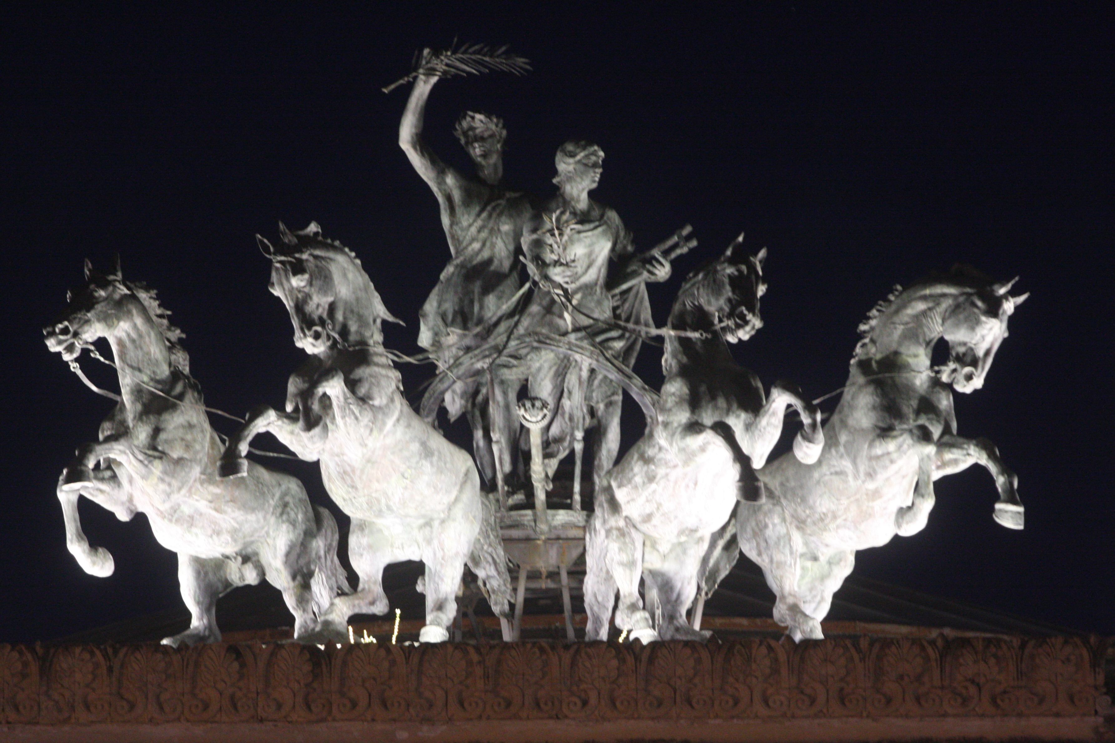 A partire dalla serata di mercoledì 7 maggio, si sono nuovamente accese le luci che valorizzano la celebre “Quadriga bronzea di Apollo” – capolavoro dello scultore Mario Rutelli – accompagnata da una coppia di cavalli in bronzo firmata dal rinomato Benedetto Civiletti, che svetta maestosa sopra l’ingresso del Politeama Garibaldi.