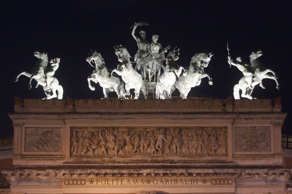 A partire dalla serata di mercoledì 7 maggio, si sono nuovamente accese le luci che valorizzano la celebre “Quadriga bronzea di Apollo” – capolavoro dello scultore Mario Rutelli – accompagnata da una coppia di cavalli in bronzo firmata dal rinomato Benedetto Civiletti, che svetta maestosa sopra l’ingresso del Politeama Garibaldi.