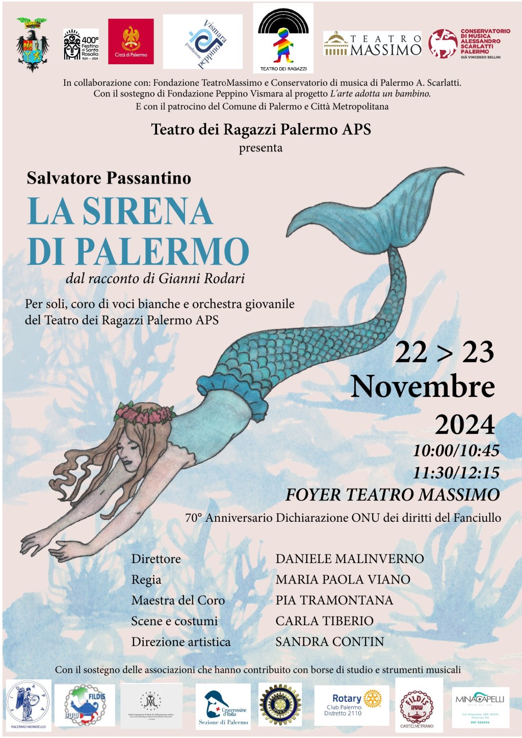 Sarà presentata alle 11 di lunedì 18 novembre nella sala stampa di Palazzo Palagonia, “La Sirena di Palermo”, opera lirica in due atti per soli, coro di voci bianche e orchestra giovanile dell’associazione “Teatro dei Ragazzi Ets”, tratta dal racconto di Gianni Rodari, che andrà in scena nel Foyer del Teatro Massimo di Palermo venerdì 22 e sabato 23 Novembre, in occasione del 70° anniversario della “Dichiarazione Onu dei Diritti del Fanciullo”.
