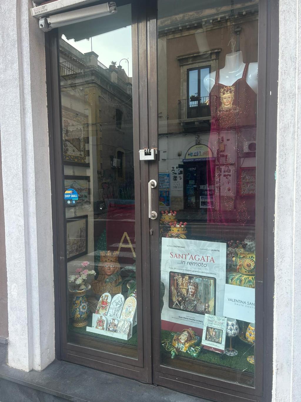 L’allestimento della vetrina non si limita all’abito, ma diventa una vera e propria celebrazione della tradizione catanese. Infatti, accanto all’abito, sono esposte alcune opere in ceramica, specificamente dedicate alla figura di Sant’Agata. Le ceramiche, tipiche dell’artigianato locale, aggiungono un ulteriore livello di profondità all’esposizione, integrando l’arte sacra con il patrimonio culturale della città. L’abbinamento con il volume “Sant’Agata…in Remoto”, curato dai giornalisti Carmelo Aurite e Sonia Distefano, completa il percorso visivo e narrativo, offrendo al pubblico una riflessione più ampia sulla figura di Sant’Agata, sia dal punto di vista storico che simbolico.