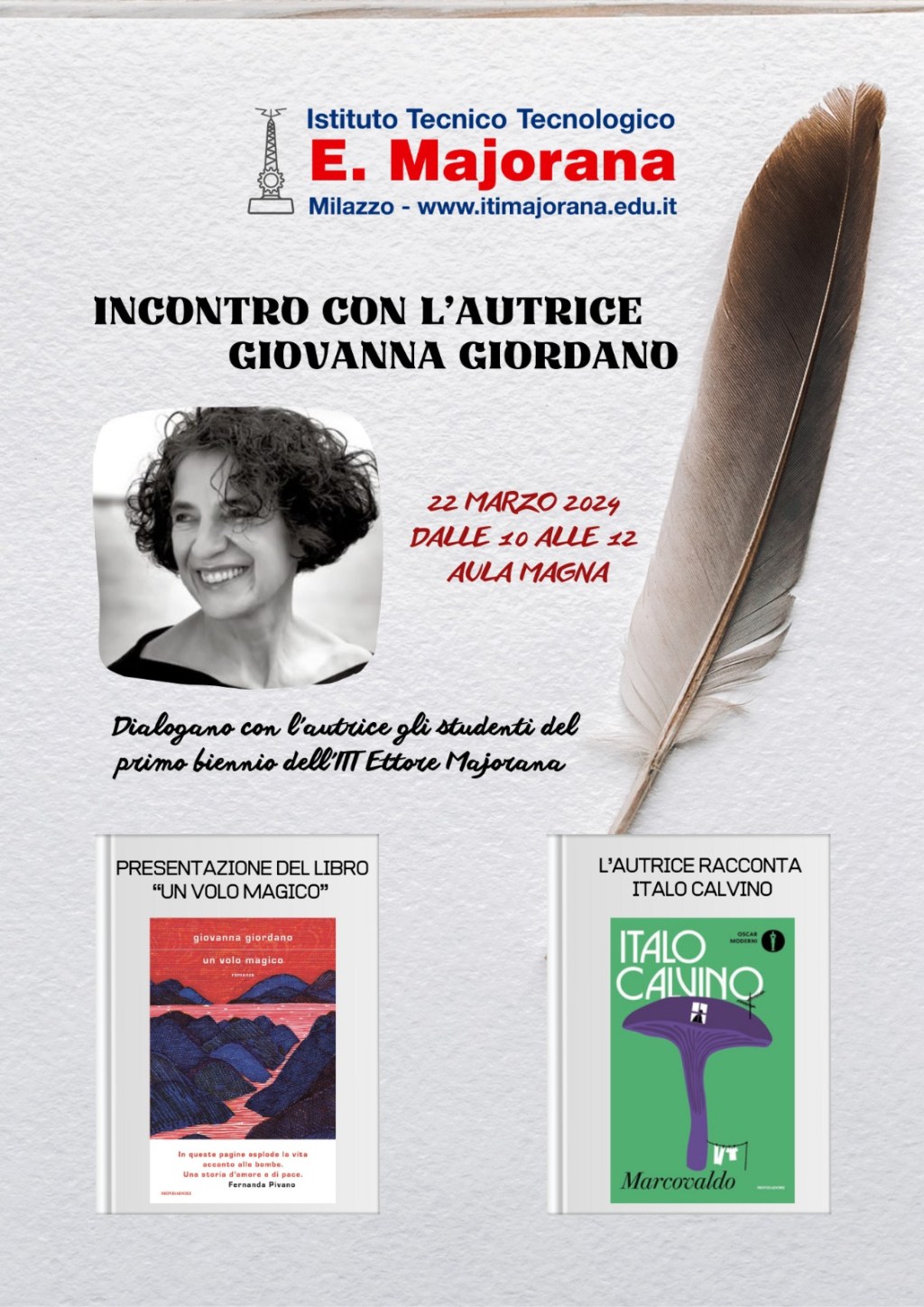 A pochi giorni, il prossimo 24 marzo, dalla Giornata nazionale per la promozione della lettura, istituita con decreto del Presidente del Consiglio dei Ministri del 15 luglio 2009 per sensibilizzare tutti i cittadini, e in particolar modo le nuove generazioni, sull’importanza della lettura, il tecnologico mamertino è stato protagonista di un ulteriore appuntamento di cultura e approfondimento, ospitando nei propri locali la scrittrice Giovanna Giordano, la quale ha presentato il suo libro dal titolo “Un volo magico” e ha dialogato con gli studenti coinvolti nell’attività sul pensiero e sulla produzione letteraria di Italo Calvino, partendo proprio dalla lettura di alcune pagine del libro “Marcovaldo”.