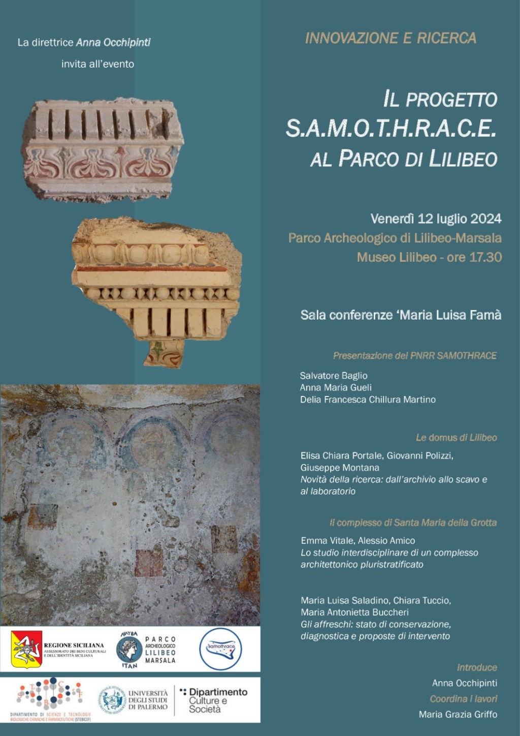 Venerdì 12 luglio alle ore 17.30 nella sala conferenze ‘Maria Luisa Famà, il Parco di Lilibeo, in collaborazione con i Dipartimenti STEBICEF e Culture e Società dell’Università di Palermo, promuove un incontro per presentare i primi, promettenti, risultati del progetto PNRR S.A.M.O.T.H.R.A.C.E., che da oltre un anno si sta svolgendo a Marsala coinvolgendo docenti e ricercatori, sia dell’Ateneo palermitano sia del CNR, in due campi di interesse scientifico: gli apparati decorativi delle domus lilibetane e il complesso monumentale di Santa Maria della Grotta.