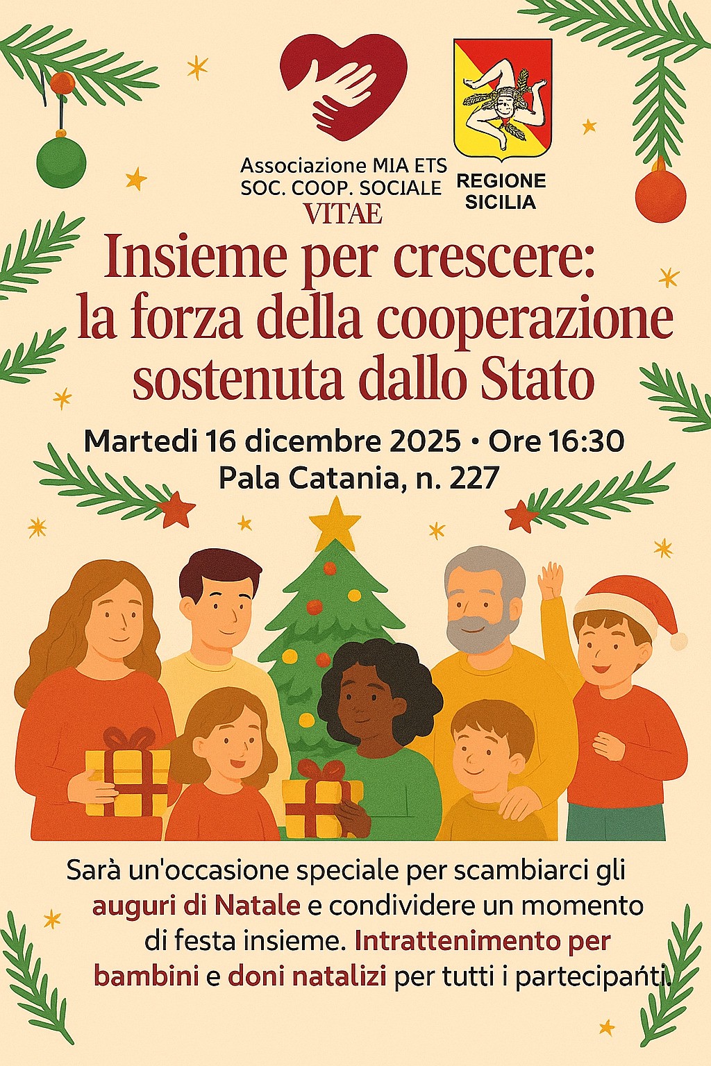 Martedì 16 dicembre 2025, a partire dalle ore 16:30, il PalaCatania ospiterà l’evento conclusivo del percorso “La cooperazione è donna”, promosso dall’Associazione MIA ETS e dalla Società Cooperativa Sociale Vitae. Un’iniziativa che chiude idealmente il ciclo avviato lo scorso 4 dicembre e che unisce formazione, cultura, solidarietà e spirito natalizio.