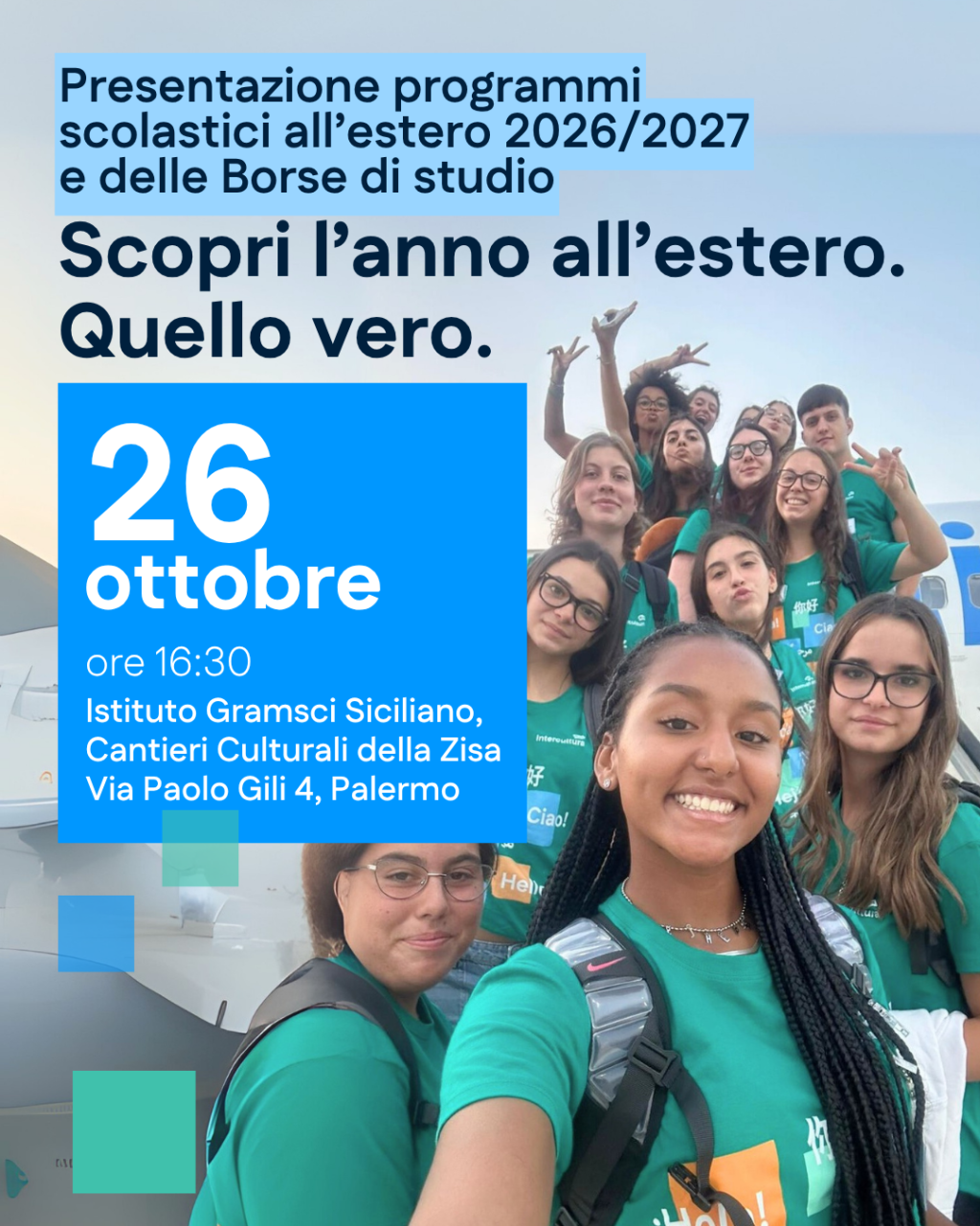 Intercultura Palermo presenta i programmi di studio all’estero 2026/2027 – Domenica 26 ottobre, ore 16:30 – Istituto Gramsci Siciliano, Cantieri Culturali alla Zisa (Palermo)