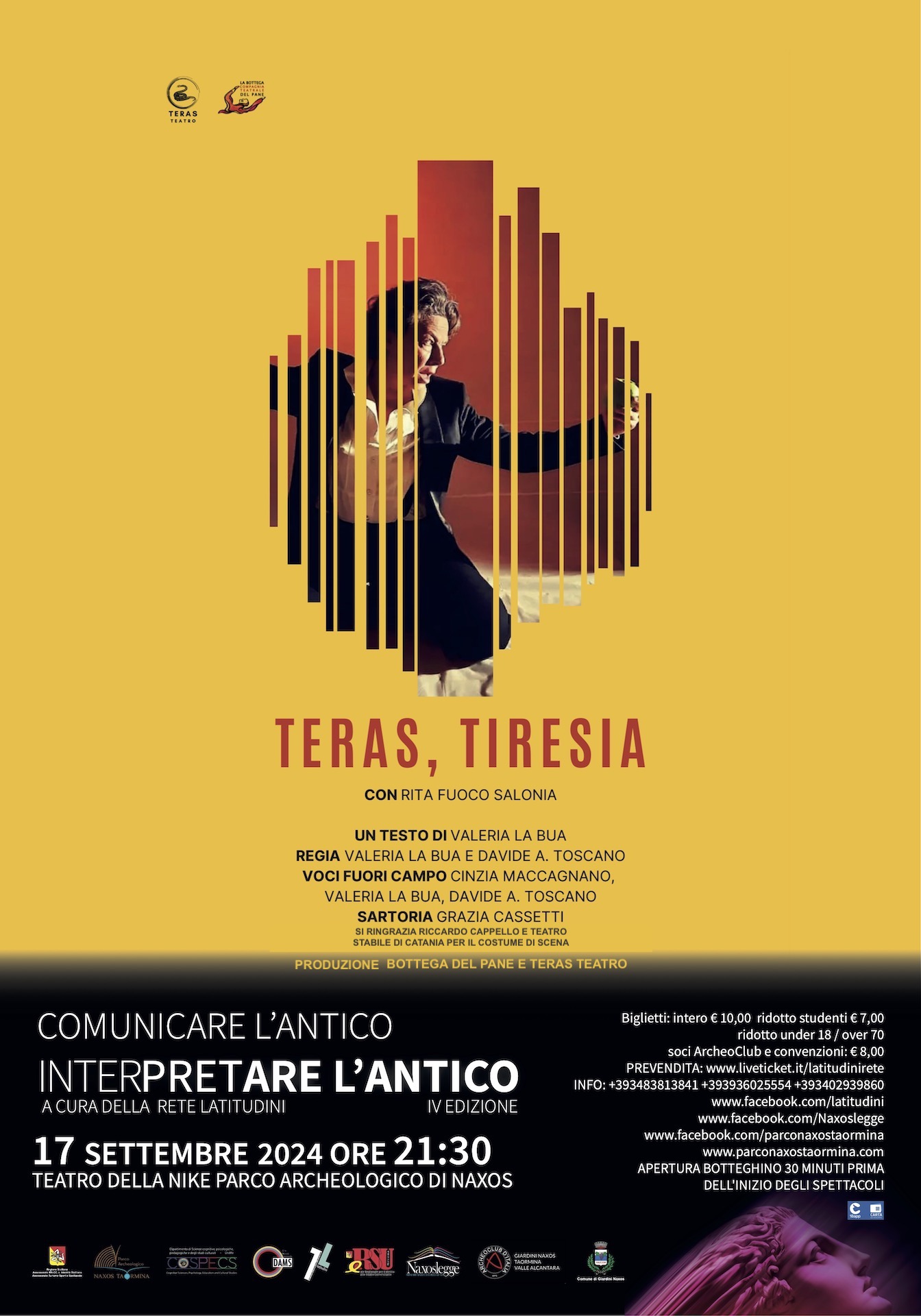 Martedì 17 settembre alle 21.30 “Teras, Tiresia” (nuova coproduzione Teras Teatro – Bottega del Pane) di Valeria La Bua, che ne cura anche la regia con Davide A. Toscano; protagonista l’attrice Rita Fuoco Salonia, apprezzatissima interprete della versione corta dello stesso spettacolo, presentato in anteprima nell’edizione 2023.