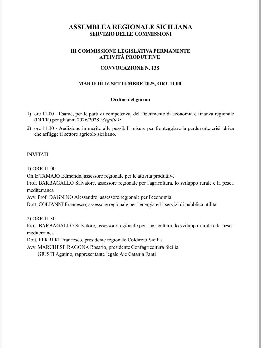 In tale contesto, siamo stati convocati il 16 settembre 2025 per esporre le diverse tematiche e valutare un piano strategico volto a fornire un concreto sollievo alle aziende agricole, nonché ai cittadini nelle loro necessità quotidiane. Grazie al nostro intervento e alle numerose segnalazioni presentate, la Regione Sicilia ha comunicato che sono state attivate modalità straordinarie per attingere acqua dagli invasi.