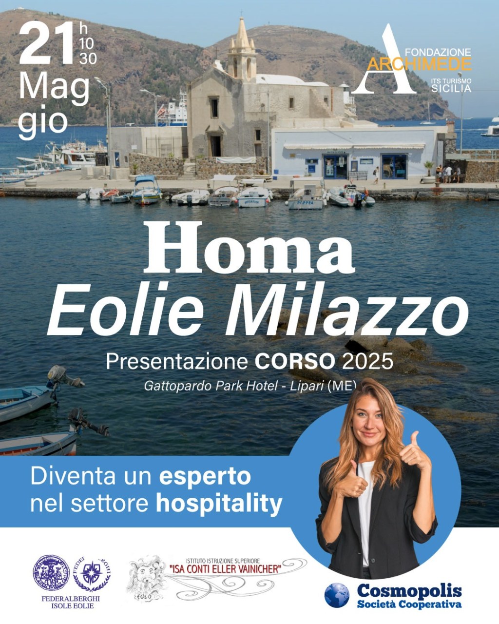 Si terrà mercoledì 21 maggio, alle 10.30, a Lipari, presso il Gattopardo Park Hotel, la giornata di orientamento del nuovo corso di alta formazione HOMA – Hospitality Management, promosso da ITS Academy Fondazione Archimede. L’iniziativa è realizzata in collaborazione con Federalberghi Isole Eolie, con l’Istituto Isa Conti Eller Vainicher di Lipari e la società Cosmopolis.