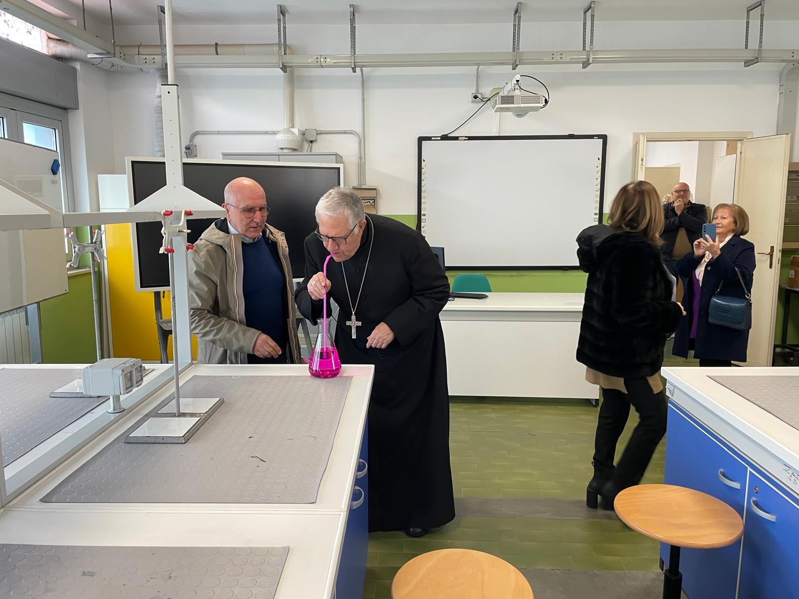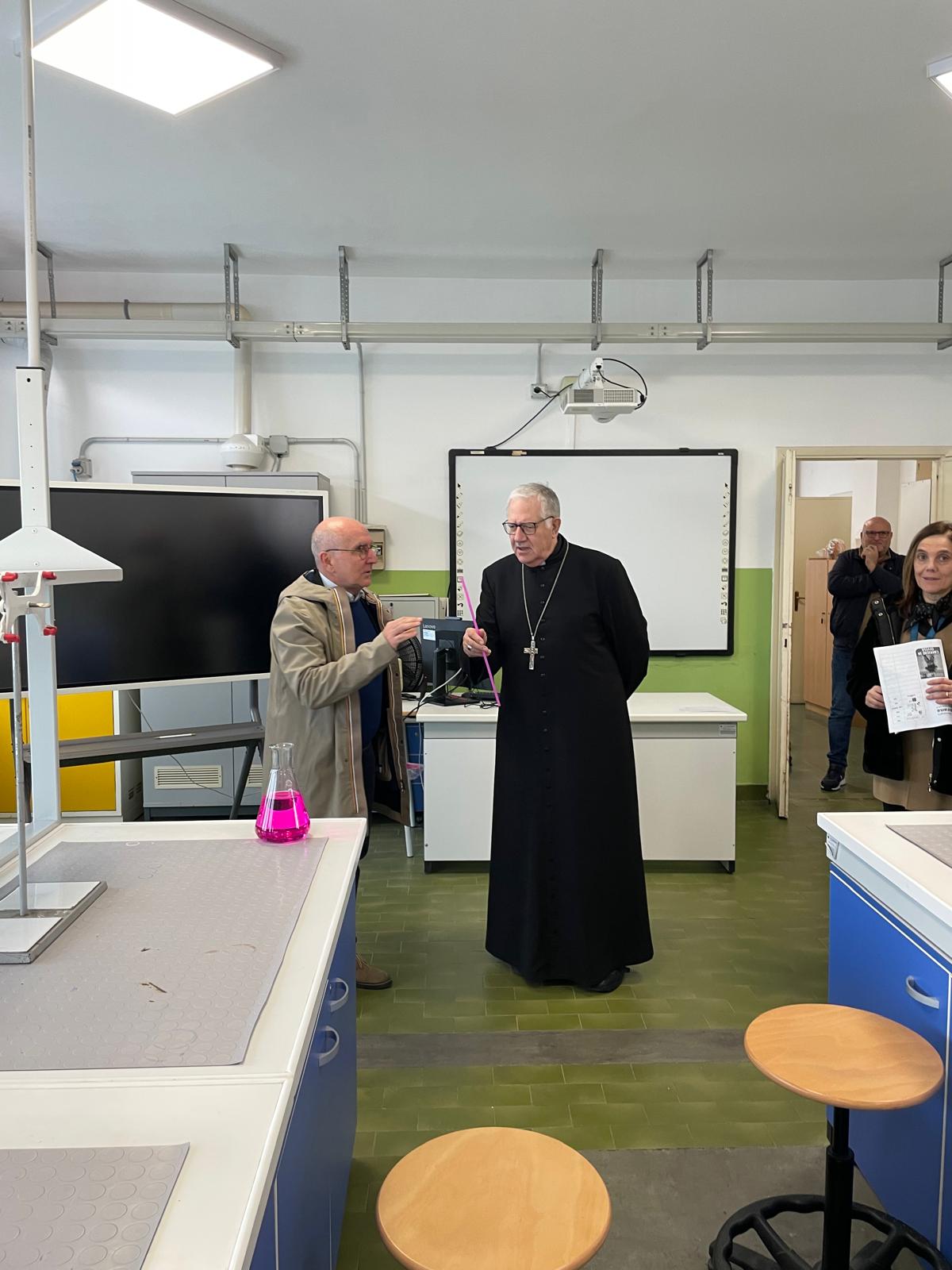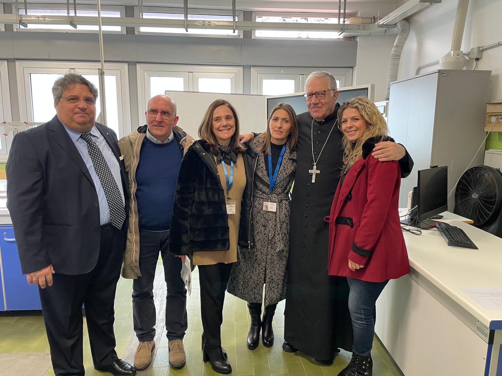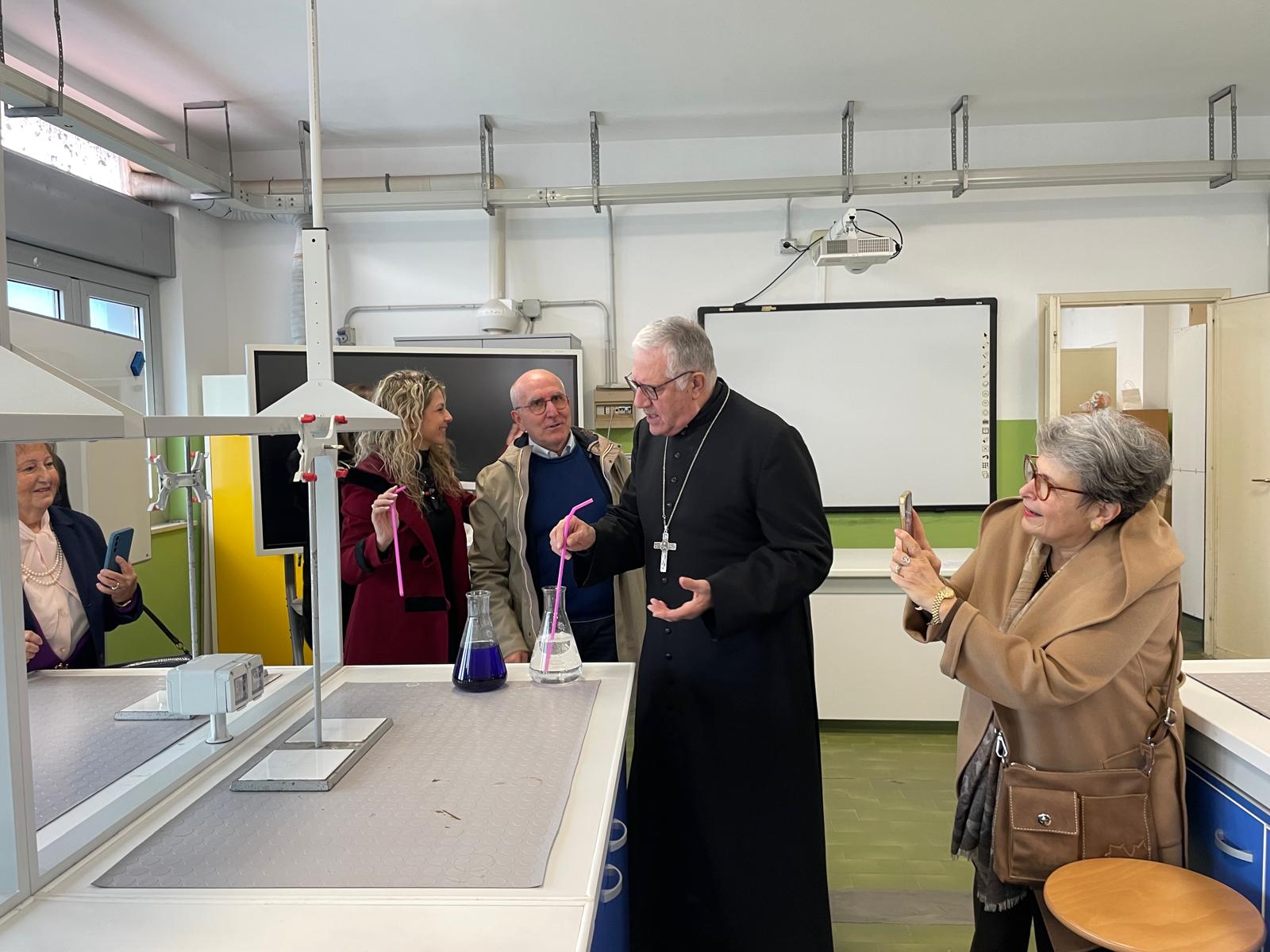 Dopo aver omaggiato l’illustre ospite con una targa ricordo, lo stesso è stato accompagnato a visitare gli avanzati laboratori tecnologici dell’istituto e qui, passeggiando nei corridori, il dirigente Castrovinci ha fatto constatare all’arcivescovo il silenzio che proveniva dalle aule, frutto di un costante lavoro educativo che è la missione principale dell’istituto.