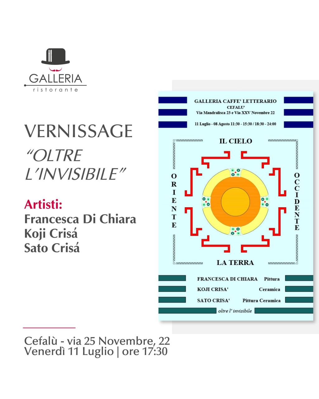 Venerdì 11 luglio, alle 17.30, presso i locali del ristorante La Galleria di Cefaù, in via Mandralisca, si terrà a battesimo la mostra dal titolo “Il cielo e la terra tra oriente e occidente” che metterà insieme le espressioni artistiche della pittrice e insegnate di Yoga Francesca Di Chiara, dell’architetto e designer Koji Crisa’ e dell’architetto e artista Sato Crisà.