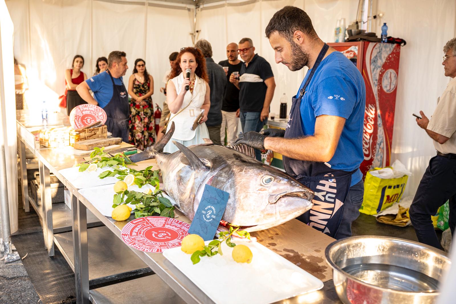 Il Mastro Salatore Alfio Visalli, dal suo canto, ha imbandito una vera e propria “lectio magistralis” sul taglio del tonno, focalizzandosi sul fatto che in cucina non si butta mai nulla e bisogna trattare il pesce in modo quasi spirituale. Lui stesso da chef e formatore attraverso la Blu Lab Academy, oltre che artefice della bottarga di tonno e tonno sott’olio, ha avvertito il pubblico che noi siamo quello che mangiamo e altrettanto quello che sporchiamo come il mare. “Prendiamoci cura di lui e dei suoi abitanti”. All’unanimità questo è quanto è emerso da ogni dibattito e da ogni espressione produttiva dell’evento (Azienda Agricola Pietra Zita con conserve ed erbe aromatiche, Conserve tonno e pesce “Taudì” Rocca di Capri Leone, Azienda Agricola “Il Maiorchino” di Domenico Isgrò, Grani Antichi “Coppola e Maranzano”, Oleificio del Mela F. lli Coletta, Azienda prodotti forno “L’Antica Forneria Garofalo” di Barcellona PG – anche vetrina per Conserve Ittiche del trapanese e Cefalù, Oleificio Failla Prodotti Tipici da Carini > ha esposto pure conserve ittiche dal marsalese, Azienda Agricola Tiziana Buemi > maiorchino chef Terruso, Frangipane – Forno e Cucina Milazzo che è stato insignito del riconoscimento “Pane dell’anno” per la VII edizione della Guida Pane e Panettieri d’Italia 2026 a cura di Gambero Rosso > qui ha fornito i Tarallucci artigianali al pomodoro secco e tumminia per chef Micale, Gaglio Vignaioli dal 1910 > in abbinamento per Cooking Show e Bollita del Tonno, Terradisuli e Associazione Demetra, di spicco per la cipolla caramellata che ha condito la Bollita).