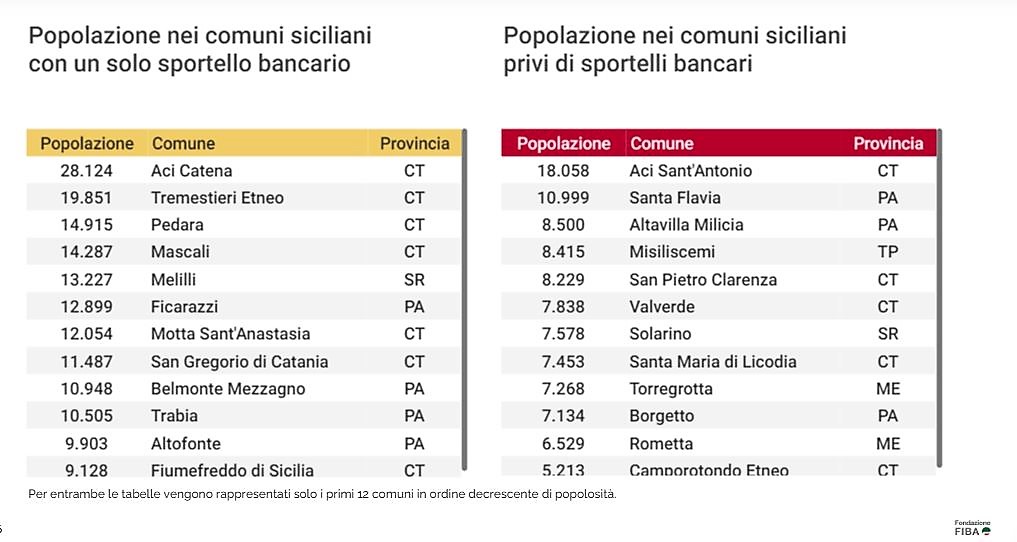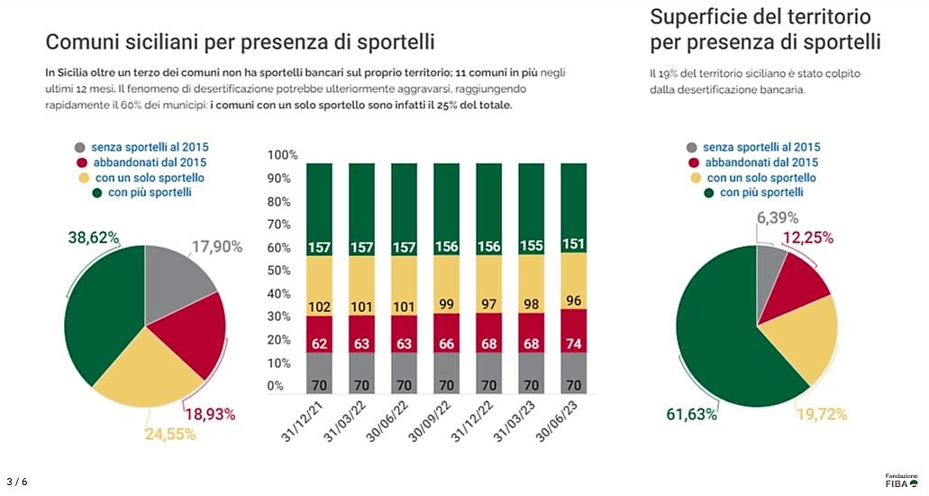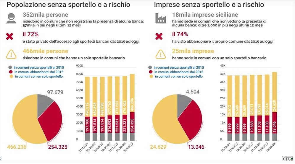 La Sicilia è una delle sei regioni, assieme a Marche, Lombardia, Lazio, Umbria e Veneto, nelle quali, la desertificazione è velocemente avanzata. Analizzando le risultanze regionali 352mila persone vivono in territori non presidiati da alcuna banca cui vanno ad aggiungersi altri 466mila utenti che hanno a disposizione un solo sportello bancario. Le imprese a rischio, senza alcuna agenzia, sono 18mila mentre altre 25mila sono servite da appena una sola dipendenza. Dal 2015 a oggi, la progressiva politica del ridimensionamento della rete commerciale bancaria, ha fatto salire al 19 per cento i comuni siciliani che non hanno assistenza. Andando al rapporto sportello per 100mila abitanti, la Sicilia registra uno dei più bassi indici: 23 contro il dato medio nazionale ch si attesta al 38,9. Anche sul fronte dell’internet banking non va meglio. Lo usa il 33 per cento dell’utenza relegando l’isola al quart’ultimo posto.