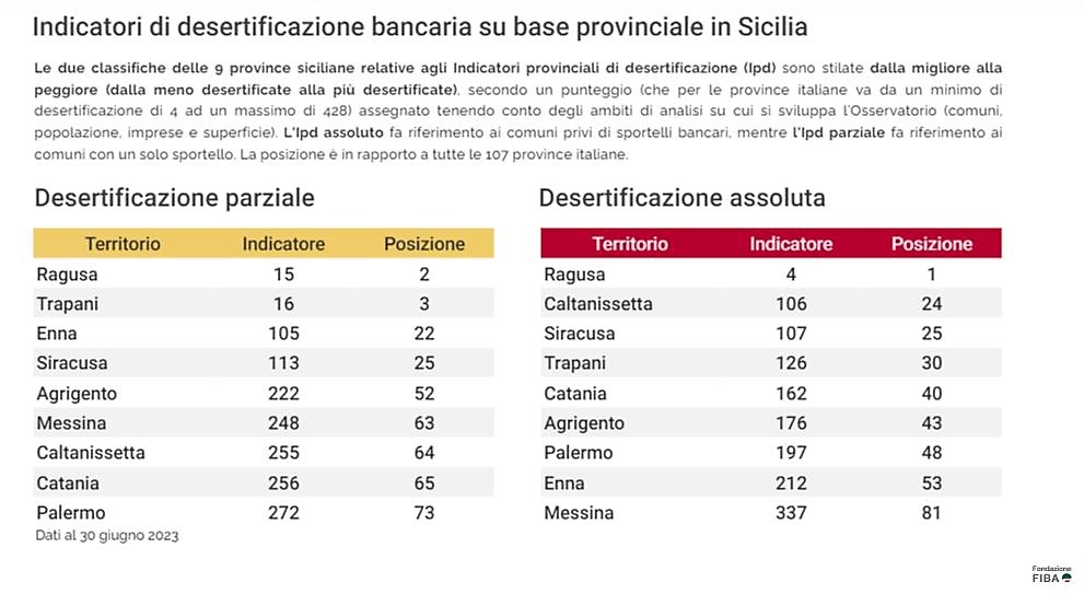 La Sicilia è una delle sei regioni, assieme a Marche, Lombardia, Lazio, Umbria e Veneto, nelle quali, la desertificazione è velocemente avanzata. Analizzando le risultanze regionali 352mila persone vivono in territori non presidiati da alcuna banca cui vanno ad aggiungersi altri 466mila utenti che hanno a disposizione un solo sportello bancario. Le imprese a rischio, senza alcuna agenzia, sono 18mila mentre altre 25mila sono servite da appena una sola dipendenza. Dal 2015 a oggi, la progressiva politica del ridimensionamento della rete commerciale bancaria, ha fatto salire al 19 per cento i comuni siciliani che non hanno assistenza. Andando al rapporto sportello per 100mila abitanti, la Sicilia registra uno dei più bassi indici: 23 contro il dato medio nazionale ch si attesta al 38,9. Anche sul fronte dell’internet banking non va meglio. Lo usa il 33 per cento dell’utenza relegando l’isola al quart’ultimo posto.