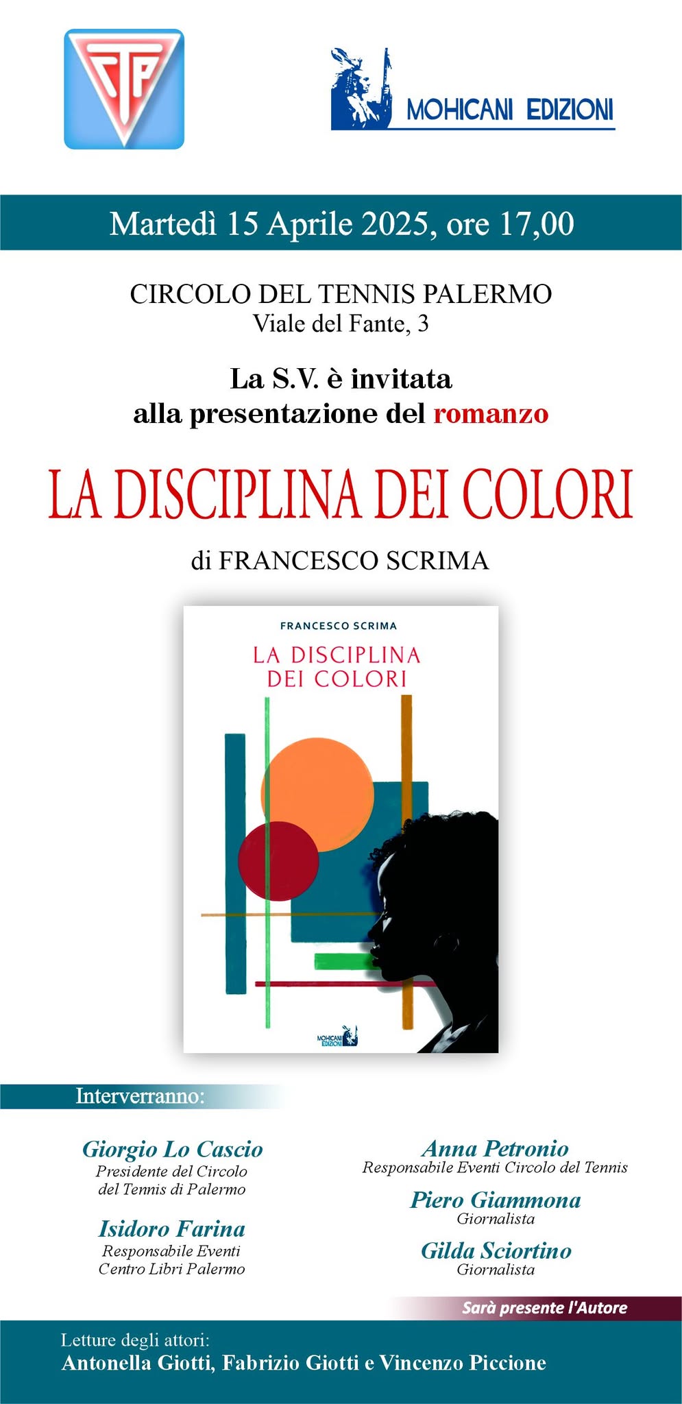 Il nuovo romanzo del docente e scrittore palermitano Francesco Scrima “La disciplina dei colori” (Mohicani Edizioni) sarà presentato martedì 15 aprile, ore 17, nel giardino del Circolo del Tennis Palermo di Viale del Fante 3.