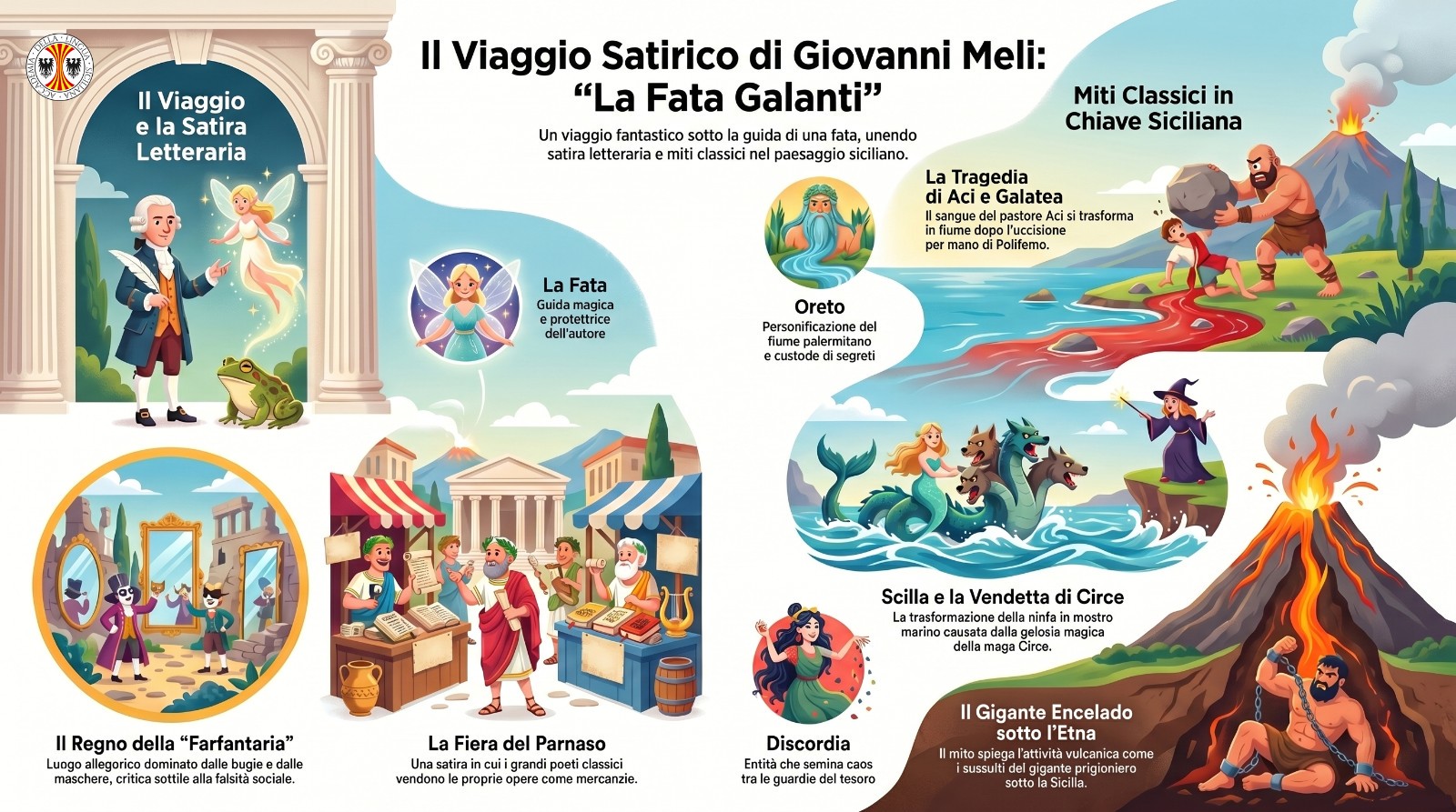 Come ormai tradizione, il 23 aprile l’Accademia dedica la giornata alla promozione di un’opera significativa della letteratura siciliana. Dopo aver scelto nel 2024 la prosa storica La Storia di Li Nurmanni ’n Sicilia di Antonio Palomes e, lo scorso anno, il monumentale poema eroico in 30.000 versi La Sicilia Liberata di Giuseppe Fedele Vitale, per il 2026 la scelta ricade su un testo di Giovanni Meli: “La Fata Galanti”. Scritto quando Meli aveva appena 19 anni, l’opera “La Fata Galanti” è un poemetto berniscu, come lo definì lo stesso Meli, cioè con stile giocoso e satirico, alla maniera del poeta toscano del ‘500 Francesco Berni.