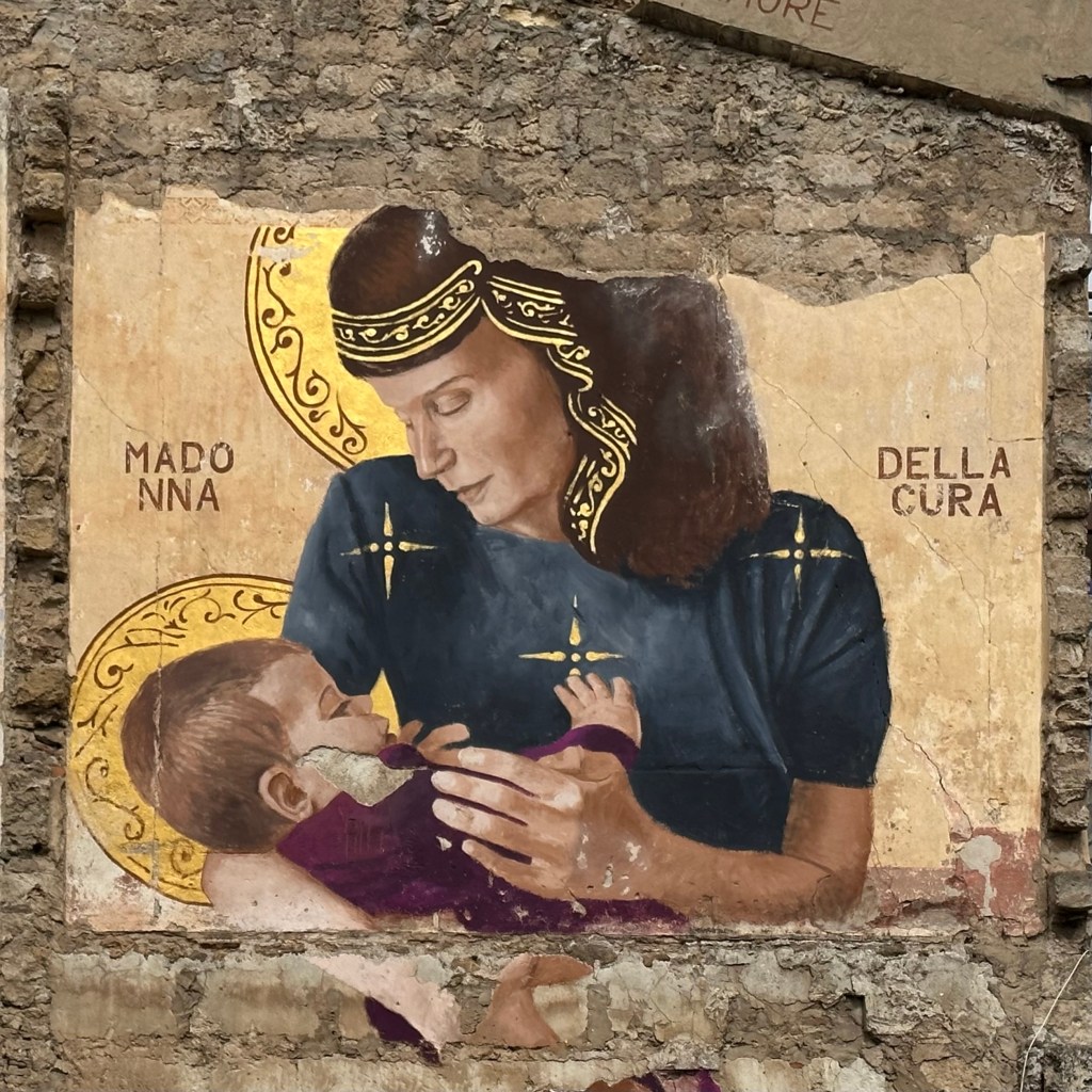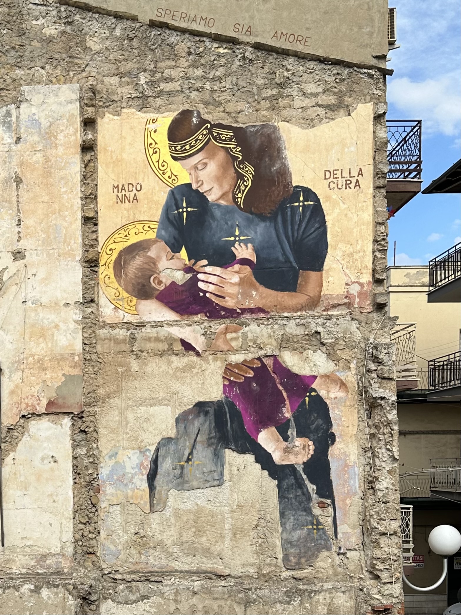 Il dipinto è stato realizzato nella città di Gela, che negli ultimi anni ha affrontato una complessa transizione dopo la chiusura della raffineria. Un evento che ha avuto un impatto significativo sulla comunità, sia in termini di occupazione che di salute ambientale. Il dipinto di Igor Scalisi Palminteri riflette l’importanza di affrontare e risolvere le sfide ambientali che Gela e altre comunità possono incontrare. La Madonna della Cura ritrae infatti una madre amorevole che si prende cura di un bambino, immagine tenera e potente al tempo stesso, richiamo diretto all’importanza di prendersi cura del territorio in cui viviamo: un messaggio universale di responsabilità collettiva.