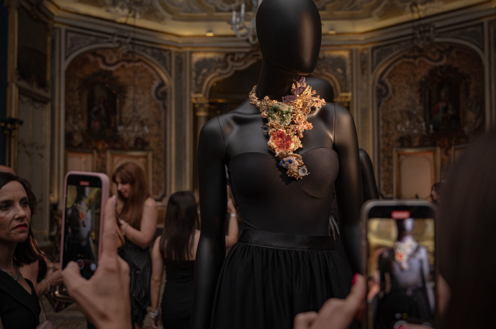 Trenta gioielli unici, per stile, ricchezza e dimensione, hanno catturato lo sguardo dei visitatori presenti al vernissage. Vere e proprie opere d’arte, posizionate al centro della immensa sala dell’antica residenza nobiliare, in fila una dietro l’altra, adagiate su essenziali manichini neri, in una sequenza crescente di luce, bellezza, stupore. “Veri e propri frammenti narrativi” li ha definiti il designer Giovanni Raspini, in cui il decoro e la struttura del gioiello sono in perfetta sintonia stilistica con le pietre utilizzate.