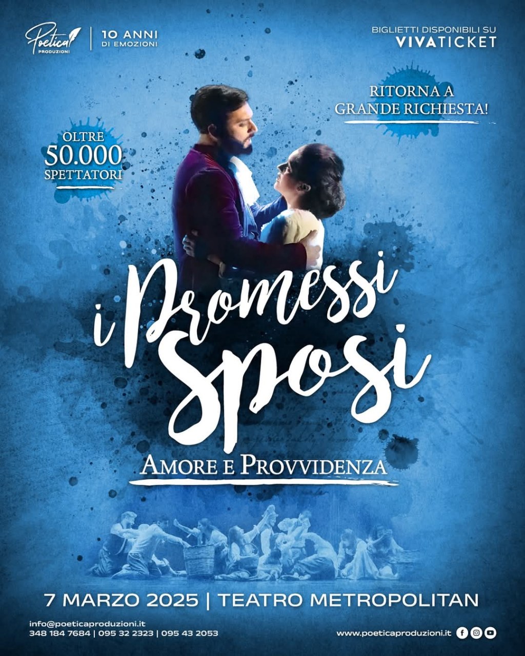 Catania- Per celebrare il decimo anno di ininterrotta attività, la Poetica Produzioni, ribattezzata dalla stampa come la “Piccola Broadway sotto il vulcano”, venerdì 7 marzo, alle ore 21.00, al teatro Metropolitan ritorna in scena con la sua produzione più applaudita ed amata da critica e pubblico: “I Promessi Sposi- Amore e Provvidenza”, questa volta ancora più potenziata e spettacolare.