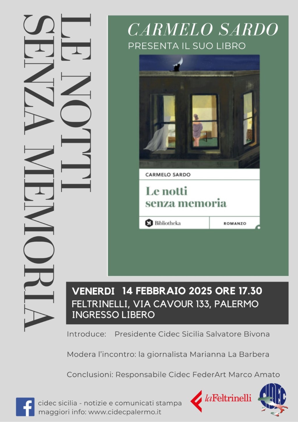 “Le notti senza memoria” è il titolo del libro di Carmelo Sardo che sarà presentato a Palermo venerdì 14 febbraio alle 17:30 negli spazi della Libreria Feltrinelli, in via Camillo Benso Conte di Cavour 133. Edito da Bibliotheka, il romanzo narra di Carlo che, nell’ultimo segmento della sua vita tormentata, ripercorre l’amore folle e delirante per Nora, donna fascinosa conosciuta per caso in un bar quando lei aveva vent’anni e lui trentadue.