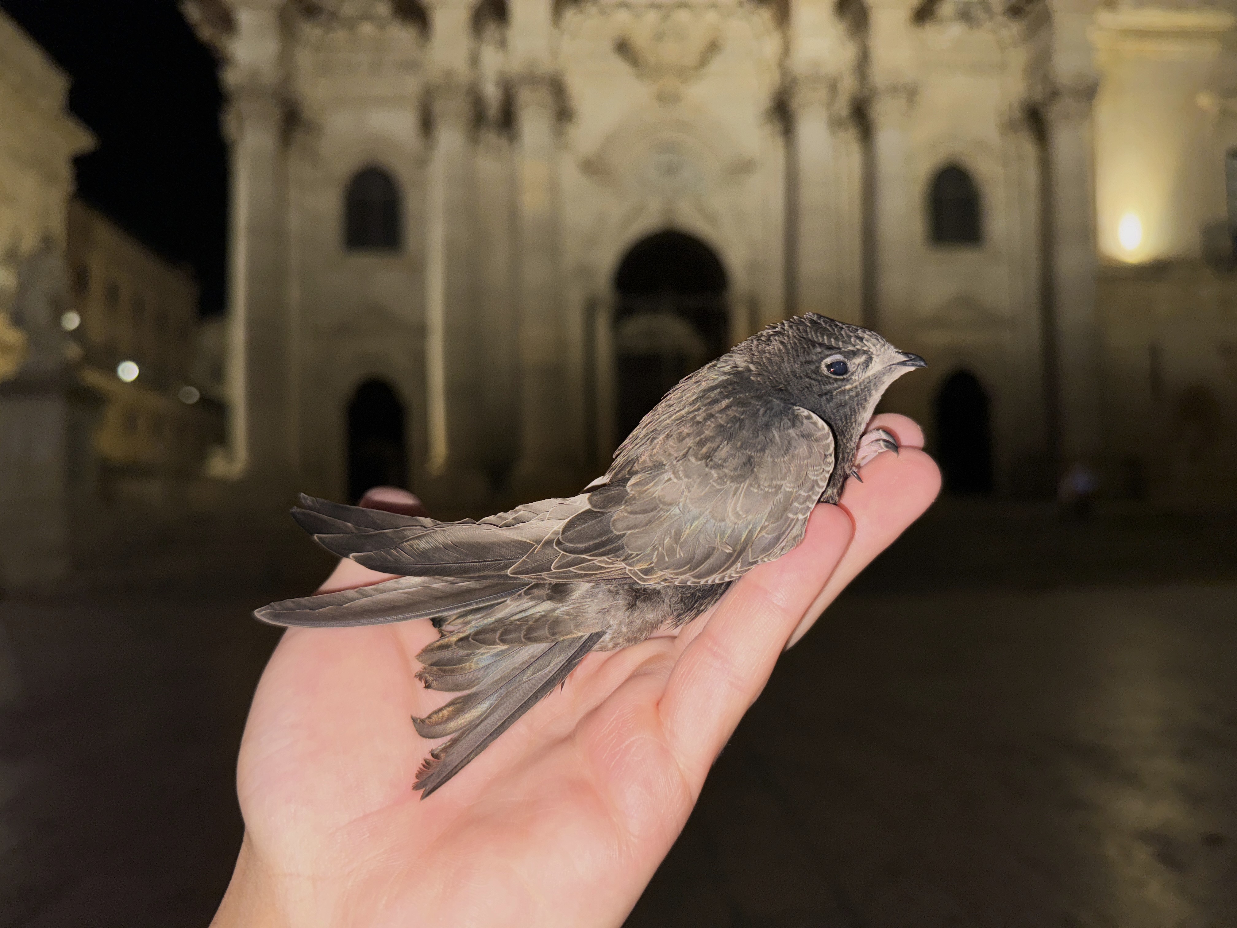 Durante una passeggiata serale a Siracusa, in piazza Duomo, nel centro storico di Ortigia, l’ambientalista Sebastian Colnaghi ha soccorso un piccolo di Rondone Eurasiatico (Apus apus è il suo nome scientifico). Mentre camminava nella vivace piazza, Colnaghi ha notato un movimento insolito: un giovane Rondone che, nel tentativo di fare le sue prime prove di volo, era atterrato in mezzo alla folla di turisti, rischiando di essere schiacciato.