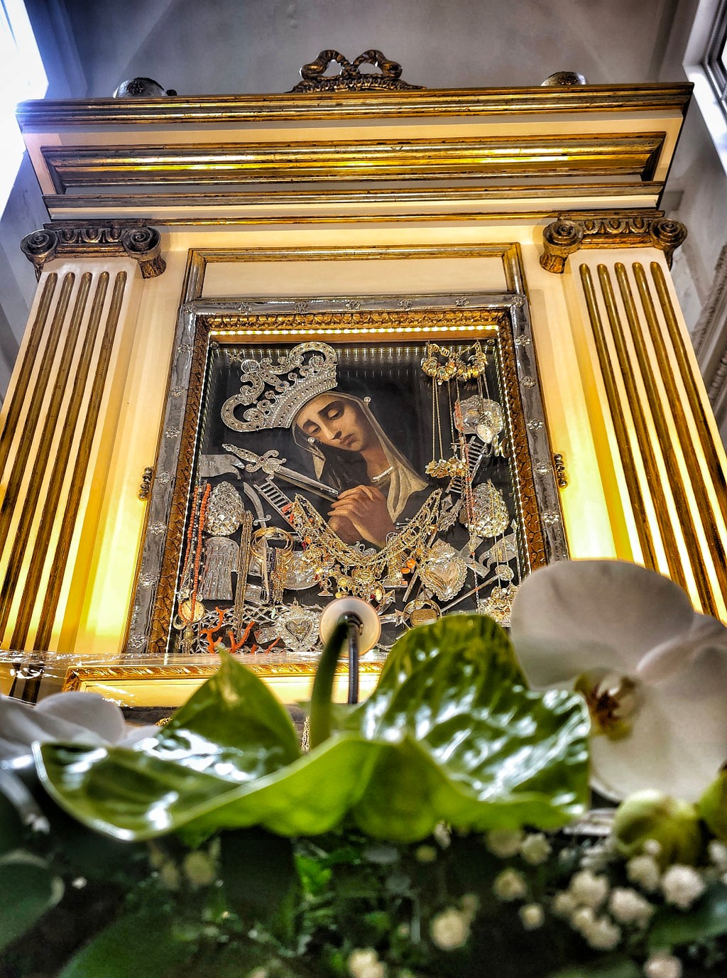 Quel quadro, custodito con amore e venerazione, non è una semplice tela dipinta. È il volto stesso del dolore materno, l’espressione universale della sofferenza di una madre di fronte al destino del proprio figlio. I suoi occhi, velati di lacrime eterne, sembrano scrutare le nostre anime, condividendo il peso di ogni nostra pena, di ogni nostra fragilità.