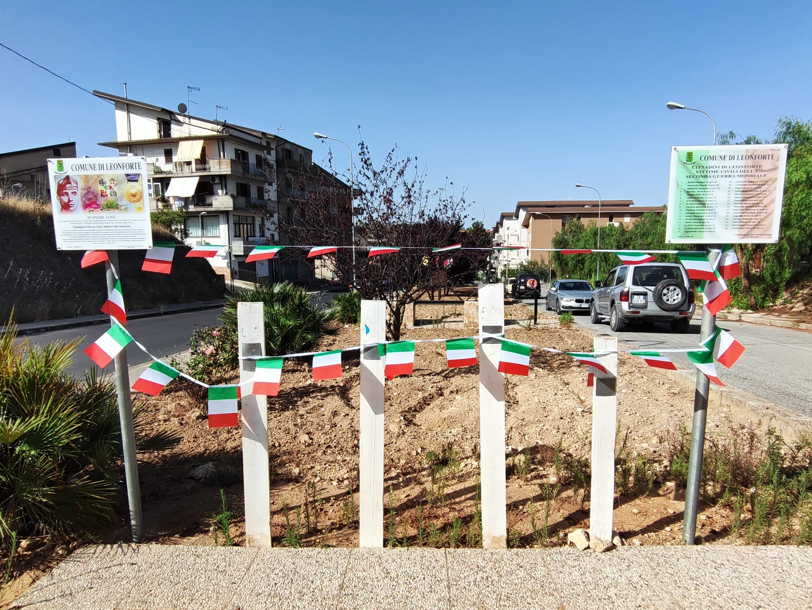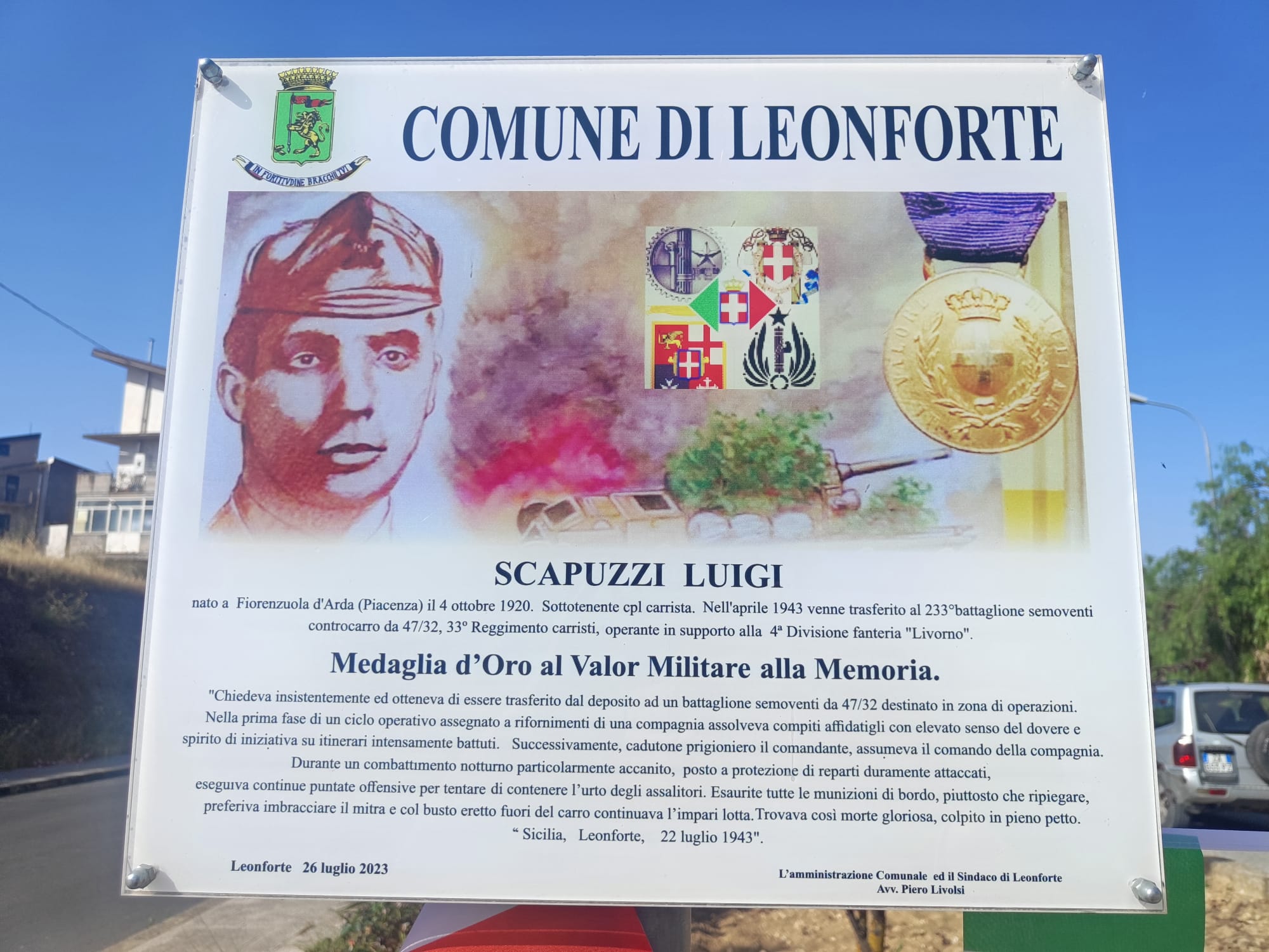 La memoria del Sottotenente Scapuzzi è oggi affidata non solo alla medaglia d’oro che ne onora il sacrificio, ma anche a un luogo simbolico: la zona dove si svolse lo scontro, in c.da S Elena, vicino l’attuale rotatoria alle porte di Leonforte, dove l’Associazione ha già collocato due tabelle commemorative che illustrano la figura dell’eroe e riportano l’elenco dei civili leonfortesi caduti nei bombardamenti anglo-americani.