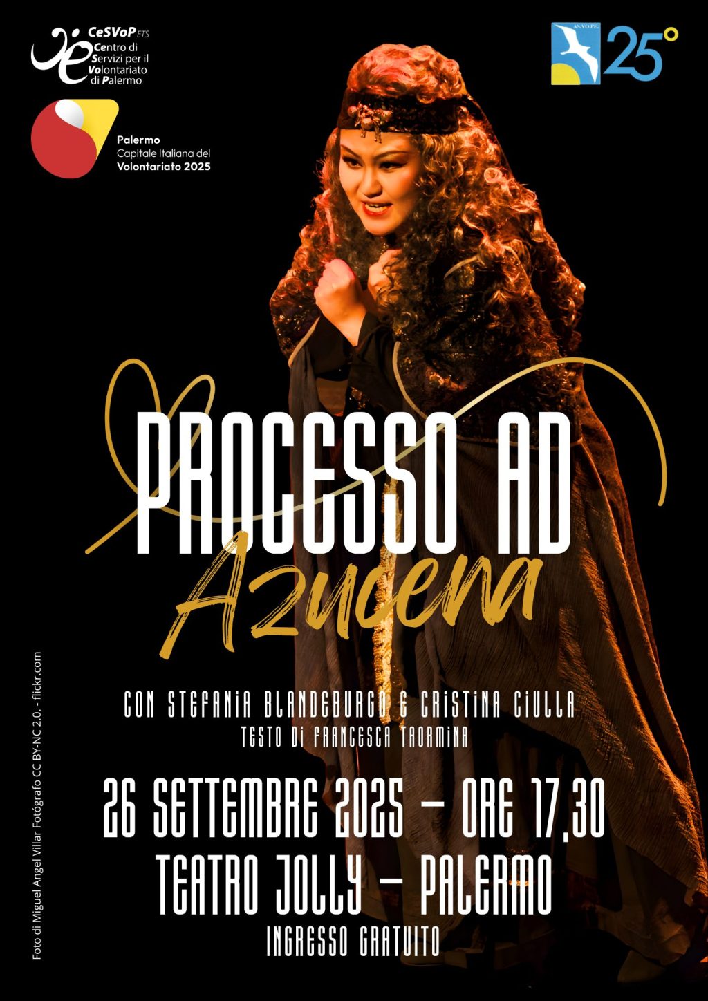 In aiuto e servizio nei confronti dei tanti bisogni delle persone detenute di Palermo da 25 anni. L’Asvope (Associazione di Volontariato Penitenziario) che opera dentro le carceri Pagliarelli ed Ucciardone. invita tutta la cittadinanza allo spettacolo teatrale “Processo ad Azucena” che si svolgerà venerdi 26 settembre alle ore 17,30 al Teatro Jolly con ingresso libero. L’evento è in collaborazione con il CeSVoP nell’ambito di Palermo Capitale Italiana del Volontariato 2025. Lo spettacolo aprirà una finestra che farà riflettere sui temi della giustizia, della condanna e della pena. Si tratta della suggestiva rilettura di uno dei personaggi più intriganti de “Il Trovatore” di Giuseppe Verdi. Azucena è zingara, donna emarginata, combattuta fra l’amore materno e l’ossessione della vendetta.